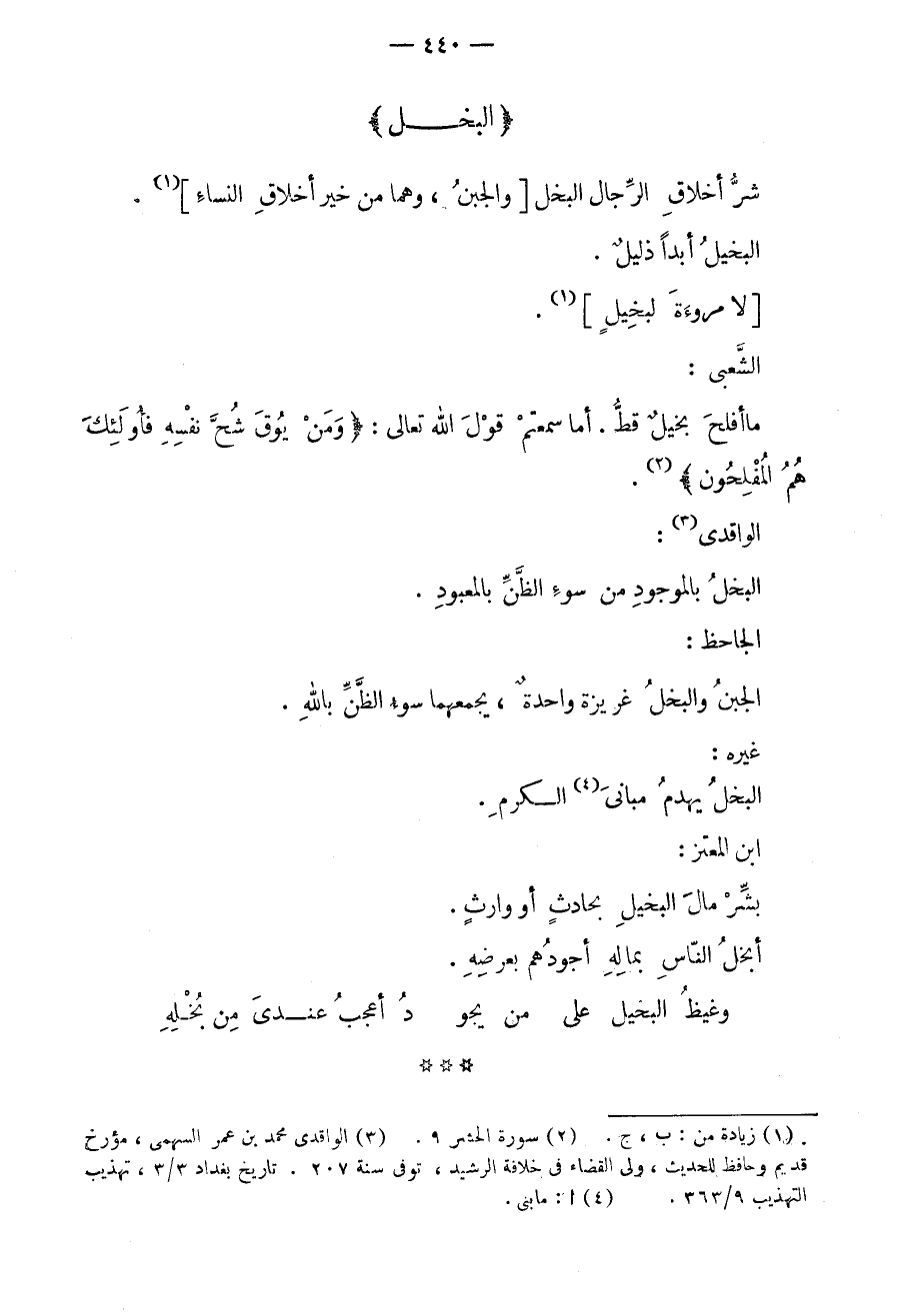 شر أخلاق الرجال البخل والجبن، وهما من خير أخلاق النساء. البخيل أبداً ذليلٌ. لا مروءة لبخيلٍ. الشعبي: ما أفلح بخيلٌ قط. أما سمعتم قول الله تعالى: " ومن يوق شحّ نفسه فأولئك هم المفلحون ". الواقدي: البخل بالموجود من سوء الظن بالمعبود. الجاحظ: الجبن والبخل غريزةٌ واحدةٌ، يجمعهما سوء الظن بالله. غيره: البخل يهدم مباني الكرم. ابن المعتز: بشر مال البخيل بحادثٍ أو وارثٍ. أبخل الناس بماله أجودهم بعرضه.