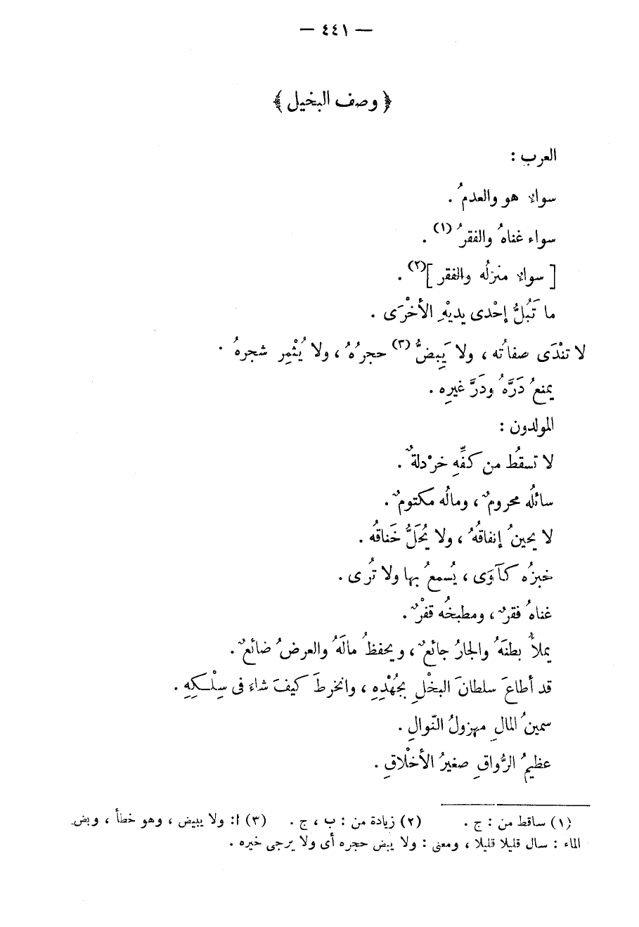 العرب: سواءٌ هو والعدم. سواءٌ غناه والفقر. سواءٌ منزله والفقر. ما تبلّ إحدى يديه الأخرى. لا تندى صفاته، ولا يبضّ حجره، ولا يثمر شجره. يمنع دره ودر غيره. المولدون: لا تسقط من كفه خردلةٌ. سائله محرومٌ، وماله مكتومٌ. لا يحين إنفاقه، ولا يحلّ خناقه. خبزه كآوى، يسمع بها ولا ترى. غناه فقرٌ، ومطبخه قفرٌ. يملأ بطنه والجار جائعٌ، ويحفظ ماله والعرض ضائعٌ. قد أطاع سلطان البخل بجهده، وانخرط كيف شاء في سلكه. سمين المال مهزول النوال. عظيم الرواق صغير الأخلاق.
