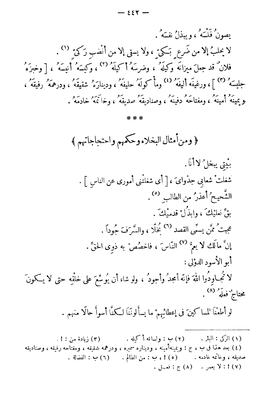 يصون فلسه ويبذل نفسه. لا يحلب إلا من ضرعٍ بكيٍّ، ولا يسقى إلا من أنضب ركيٍّ. فلانٌ قد جعل ميزانه وكيله، وضرسه أكيله، وكيسه أنيسه، وخبزه جليسه، ورغيفه أليفه، ومأكوله حليفه، وديناره شقيقه، ودرهمه رفيقه، ويمينه أمينه، ومفتاحه دفينه، وصناديقه صديقه، وخاتمه خادمه.