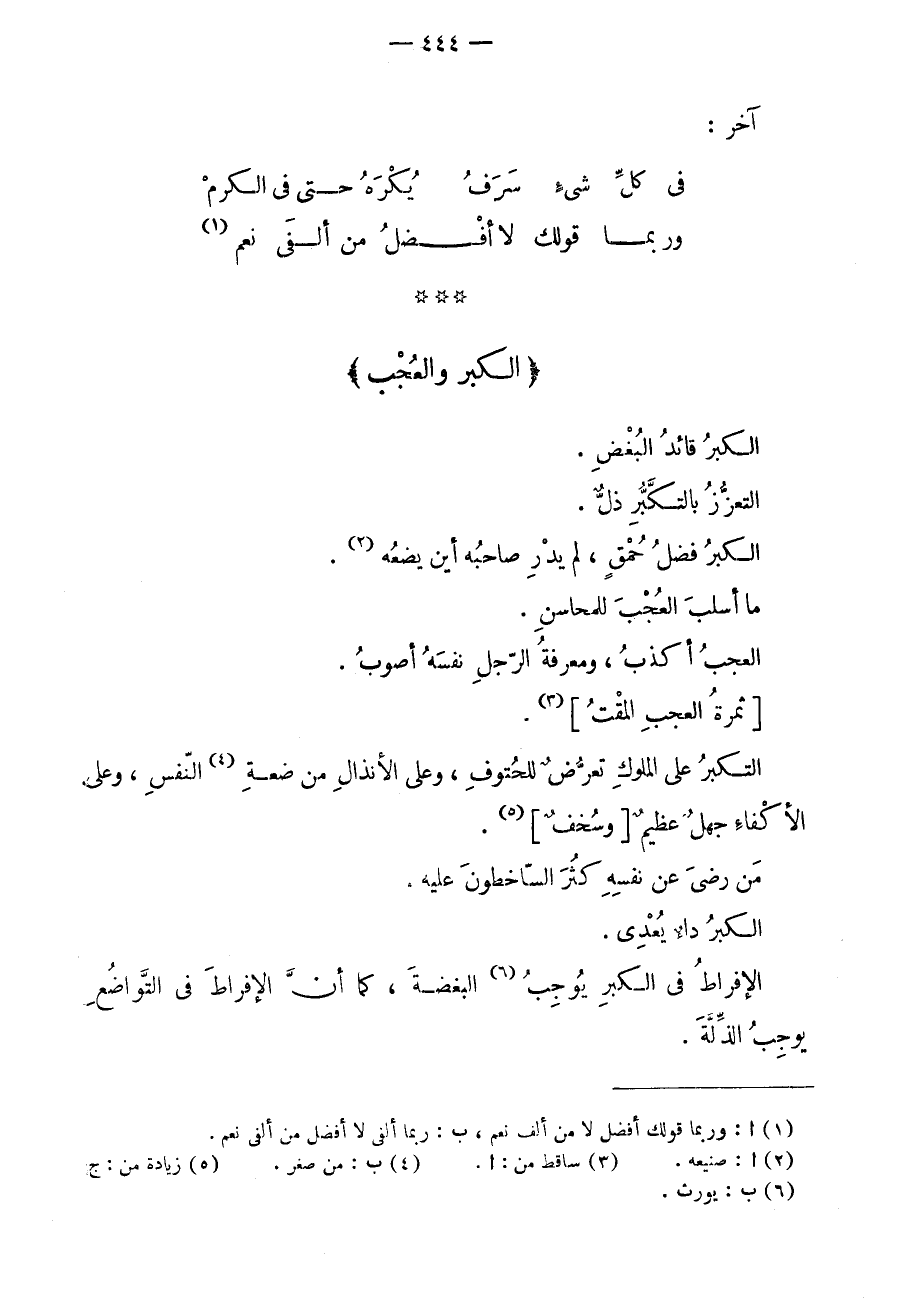 الكبر قائد البغض. التعزز بالتكبر ذل. الكبر فضل حمقٍ، لم يدر صاحبه أين يضعه. ما أسلب العجب للمحاسن. العجب أكذب، ومعرفة الرجل نفسه أصوب. ثمرة العجب المقت. التكبر على الملوك تعرضٌ للحتوف، وعلى الأنذال من ضعة النفس، وعلى الأكفاء جهلٌ عظيمٌ وسخف. من رضي عن نفسه كثر الساخطون عليه. الكبر داءٌ يعدي. الإفراط في الكبر يوجب البغضة، كما أن الإفراط في التواضع يوجب الذلة.