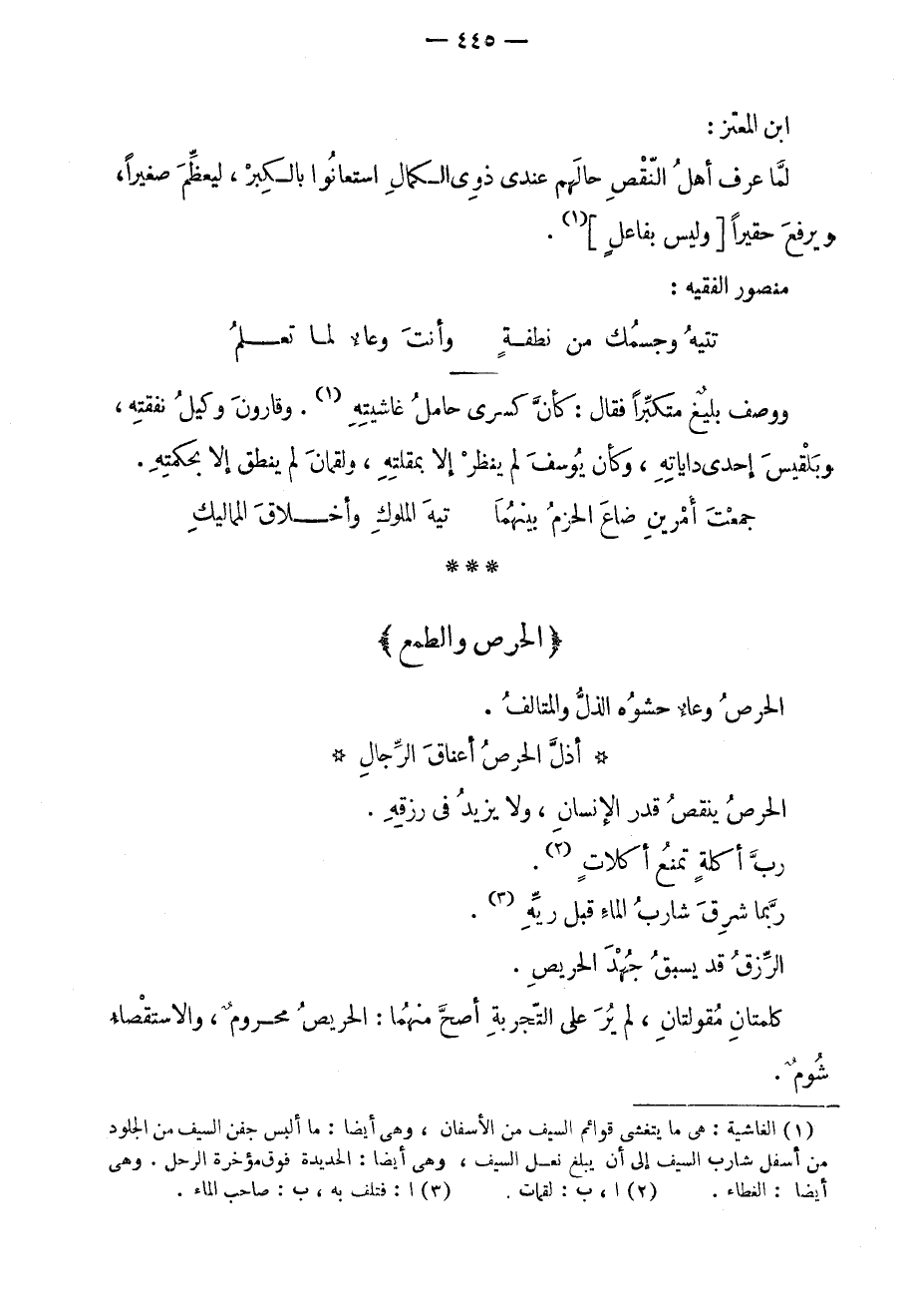 الحرص ينقص قدر الإنسان، ولا يزيد في رزقه. ربّ أكلةٍ تمنع أكلاتٍ. ربما شرق شارب الماء قبل ريه. الرزق قد يسبق جهد الحريص. كلمتان مقولتان، لم ير على التجربة أصح منهما: الحريص محرومٌ، والاستقصاء شومٌ.