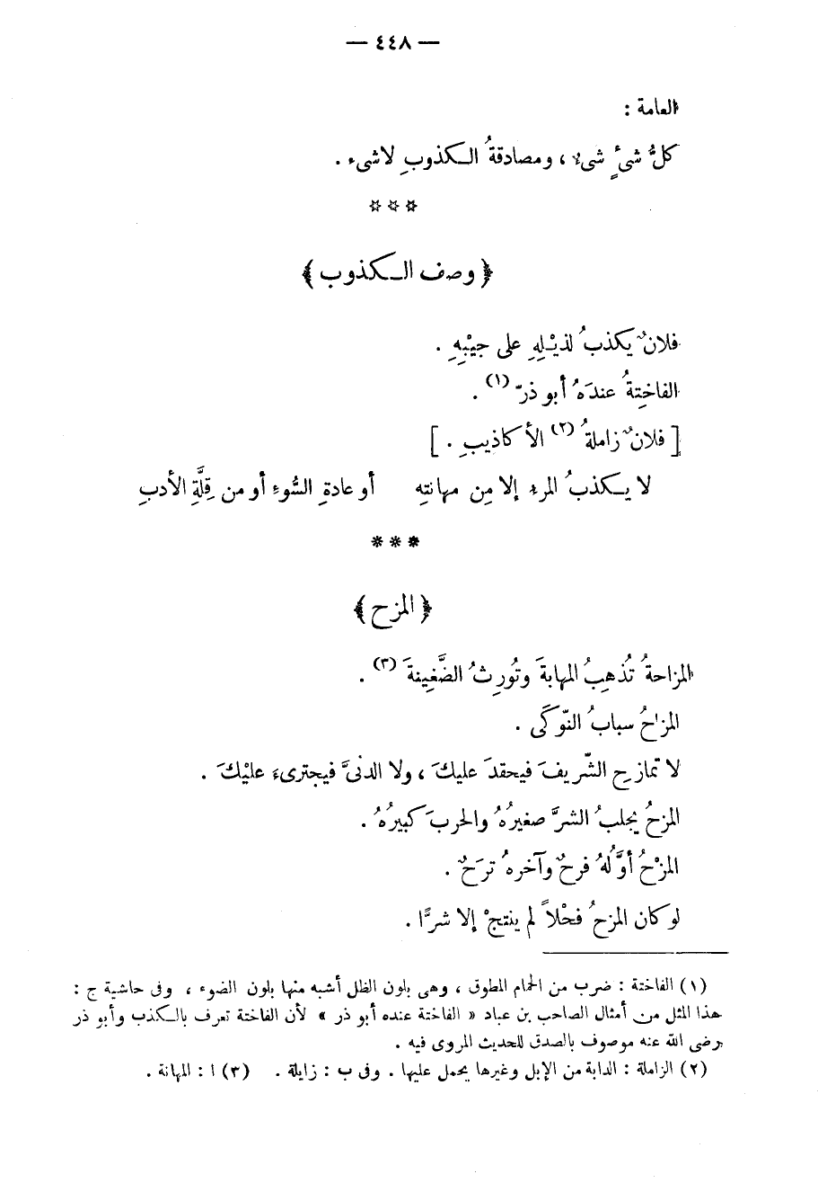 المزاحة تذهب المهابة، وتورث الضغينة. المزاح سباب النوكي. لا تمازح الشريف فيحقد عليك، ولا الدنيّ فيجترىء عليك. المزح يجلب الشر صغيره والحرب كبيره. المزح أوله فرحٌ وآخره ترحٌ. لو كان المزح فحلاً لم ينتج إلا شراً.