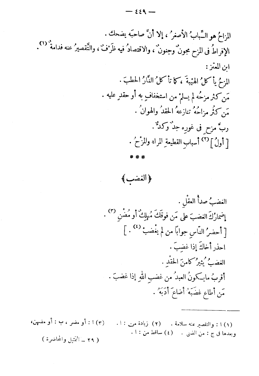 الغضب صدأ العقل. إضمارك الغضب على من فوقك مهلكٌ أو مضنٍ. أحضر الناس جواباً من لم يغضب. احذر أخاك إذا غضب. الغضب يثير كامن الحقد. أقرب ما يكون العبد من غضب الله إذا غضب. من أطاع غضبه أضاع أدبه.