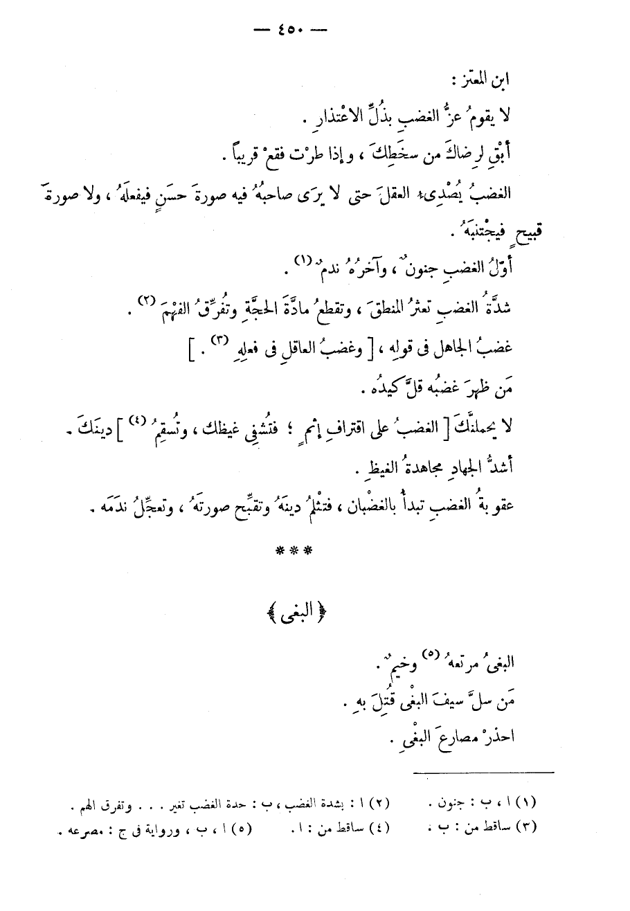 ابن المعتز: لا يقوم عز الغضب بذل الاعتذار. أبق لرضاك من سخطك، وإذا طرت فقع قريباً. الغضب يصدأ العقل حتى لا يرى صاحبه فيه صورة حسنٍ فيفعله، ولا صورة قبيحٍ فيجتنبه. أول الغضب جنونٌ، وآخره ندمٌ. شدة الغضب تعثر المنطق، وتقطع مادة الحجة، وتفرق الفهم. غضب الجاهل في قوله، وغضب العاقل في فعله. من ظهر غضبه قلّ كيده. لا يحملنك الغضب على اقتراف إثمٍ؛ فتشفي غيظك، وتسقم دينك. أشد الجهاد مجاهدة الغيظ. عقوبة الغضب تبدأ بالغضبان، فتثلم دينه وتقبح صورته، وتعجل ندمه.