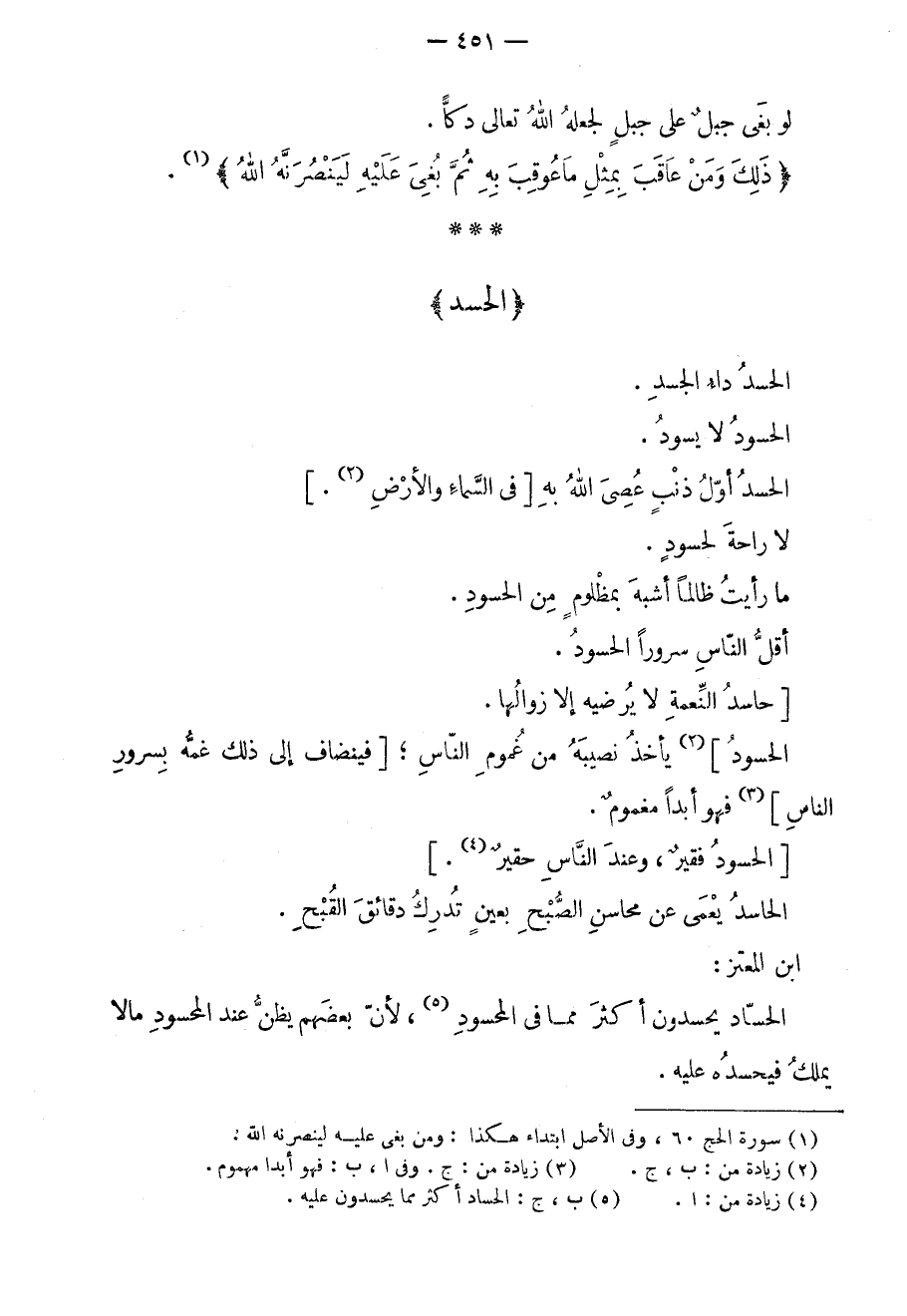 الحسد داء الجسد. الحسود لا يسود. الحسد أول ذنبٍ عصي الله به في السماء والأرض. لا راحة لحسودٍ. ما رأيت ظالماً أشبه بمظلومٍ من الحسود. أقل الناس سروراً الحسود. حاسد النعمة لا يرضيه إلا زوالها. الحسود يأخذ نصيبه من غموم الناس؛ فينضاف إلى ذلك غمه بسرور الناس فهو أبداً مغمومٌ. الحسود فقيرٌ، وعند الناس حقير. الحسود يعمى عن محاسن الصبح بعينٍ تدرك دقائق القبح. ابن المعتز: الحساد يحسدون أكثر مما في المحسود، لأن بعضهم يظن عند المحسود ما لا يملك فيحسده عليه.