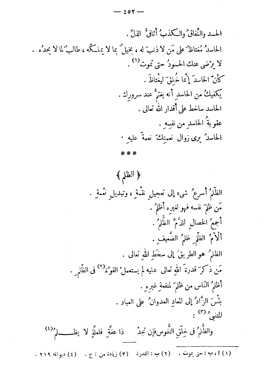 الظلم أسرع شيء إلى تعجيل نقمةٍ، وتبديل نعمةٍ. من ظلم نفسه فهو لغيره أظلم. أجمع الخصال للذم الظلم. الْأم الظلم ظلم الضعيف. الظلم هو الطريق إلى سخط الله تعالى. من ذكر قدرة الله تعالى عليه لم يستعمل القوة في الظلم. أظلم الناس من ظلم لمنفعة غيره. بئس الزاد إلى المعاد العدوان على العباد. المتنبي: