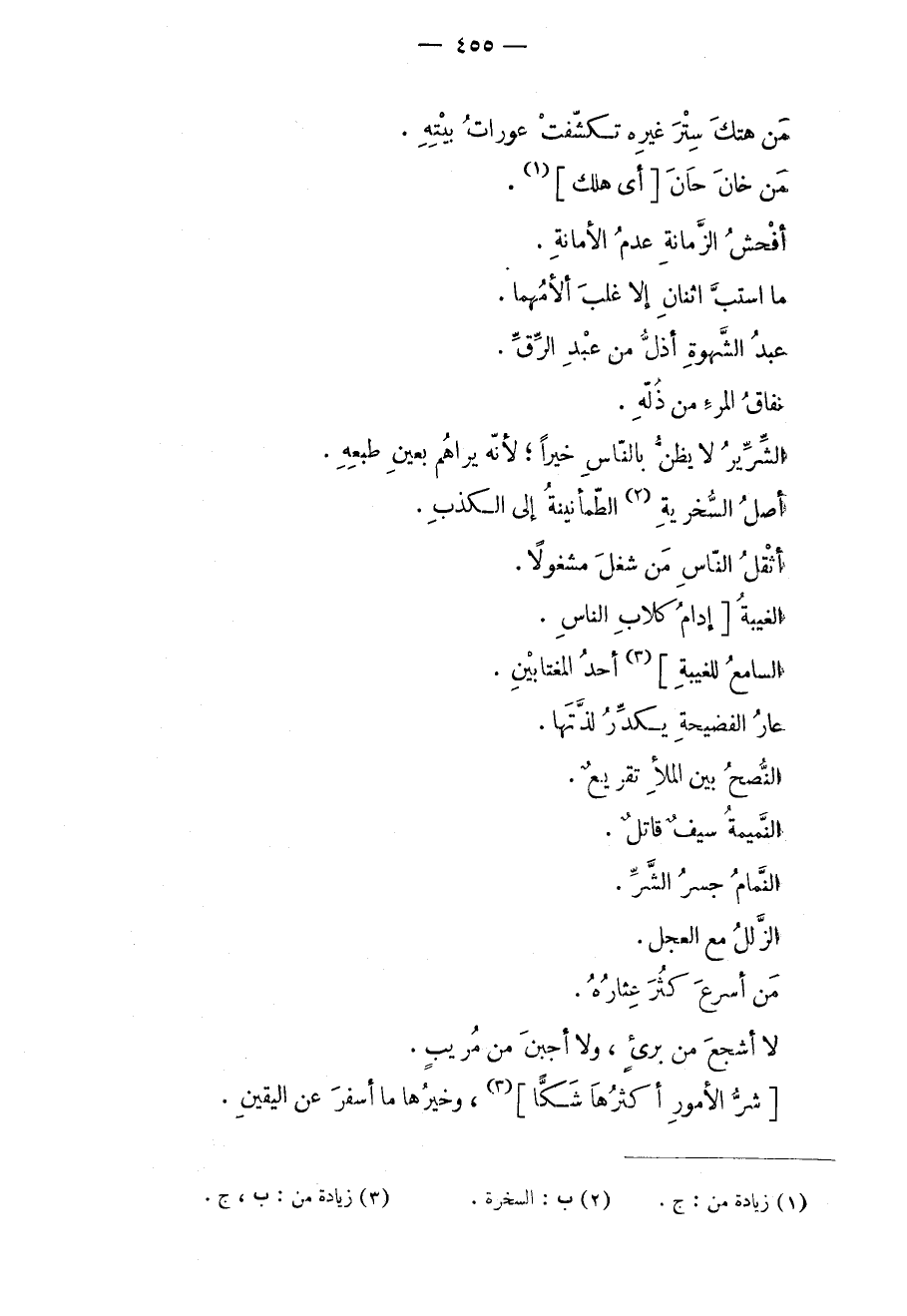 من هتك ستر غيره تكشفت عورات بيته. من خان حان أي هلك. أفحش الزمانة عدم الأمانة. ما استب اثنان إلا غلب الأمهما. عبد الشهوة أذل من عبد الرق. نفاق المرء من ذله. الشرير لا يظن بالناس خيراً؛ لأنه يراهم بعين طبعه. أصل السخرية الطمأنينة إلى الكذب. أثقل الناس من شغل مشغولاً. الغيبة إدام كلاب الناس. السامع للغيبة أحد المغتابين. عار الفضيحة يكدر لذتها. النصح بين الملأ تقريع. النميمة سيفٌ قاتلٌ. النمام جسر الشر. الزلل مع العجل. من أسرع كثر عثاره. لا أشجع من بريءٍ، ولا أجبن من مريب. شر الأمور أكثرها شكاً، وخيرها ما أسفر عن اليقين.