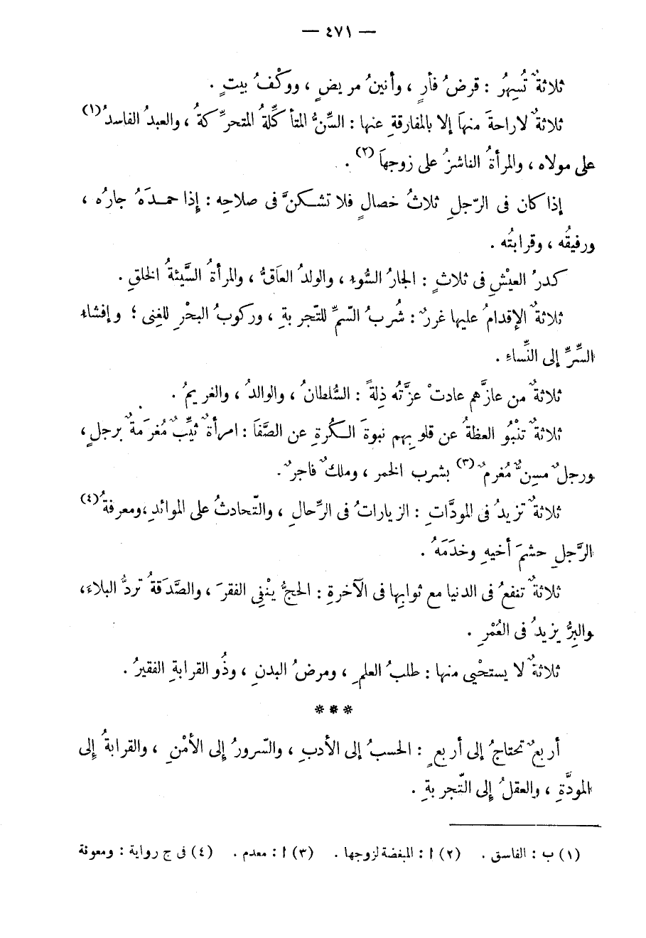 ثلاثةٌ تسهر: قرض فأرٍ، وأنين مريضٍ، ووكف بيتٍ. ثلاثةٌ لا راحة منها إلا بالمفارقة عنها: السن المتآكلة المتحركة، والعبد الفاسد على مولاه، والمرأة الناشز على زوجها. إذا كان في الرجل ثلاث خصالٍ فلا تشكنّ في صلاحه: إذا حمده جاره، ورفيقه وقرابته. كدر العيش في ثلاثٍ: الجار السوء، والولد العاق، والمرأة السيئة الخلق. ثلاثةٌ الإقدام عليها غررٌ: شرب السم للتجربة، وركوب البحر للغنى، وإفشاء السر إلى النساء. ثلاثةٌ من عازّهم عادت عزته ذلةً: السلطان، والوالد، والغريم. ثلاثةٌ تنبو العظة عن قلوبهم نبوة الكرة عن الصفا: امرأةٌ ثيبٌ مغرمةٌ برجلٍ، ورجلٌ مسنٌ مغرمٌ بشرب الخمر، وملكٌ فاجرٌ. ثلاثةٌ تزيد في المودات: الزيارات في الرحال، والتحادث على الموائد، ومعرفة الرجل حشم أخيه وخدمه. ثلاثةٌ تنفع في الدنيا مع ثوابها في الآخرة: الحج ينفي الفقر، والصدقة ترد البلاء، والبر يزيد في العمر. ثلاثةٌ لا يستحيى منها: طلب العلم، ومرض البدن، وذو القرابة الفقير. أربعٌ تحتاج إلى أربعٍ: الحسب إلى الأدب، والسرور إلى الأمن، والقرابة إلى المودة، والعقل إلى التجربة.
