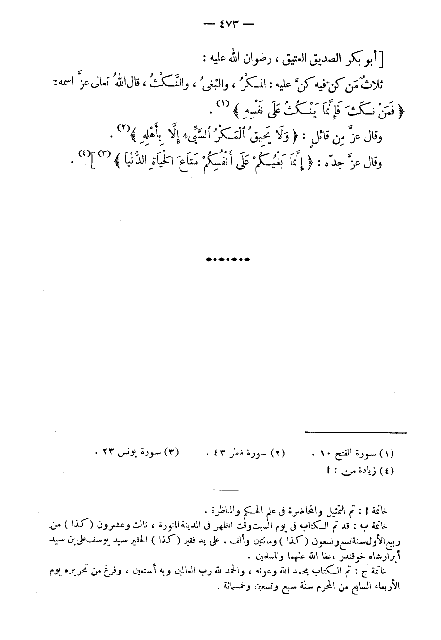 أبو بكر الصديق العتيق رضوان الله عليه: ثلاثٌ من كن فيه كن عليه: المكر، والبغي، والنكث، قال الله تعالى عزّ اسمه: " فمن نكث فإنما ينكث على نفسه ". وقال عزّ من قائل: " ولا يحيق المكر السيء إلا بأهله ". وقال عزّ جده: " إنما بغيكم على أنفسكم متاع الحياة الدنيا ".؟؟