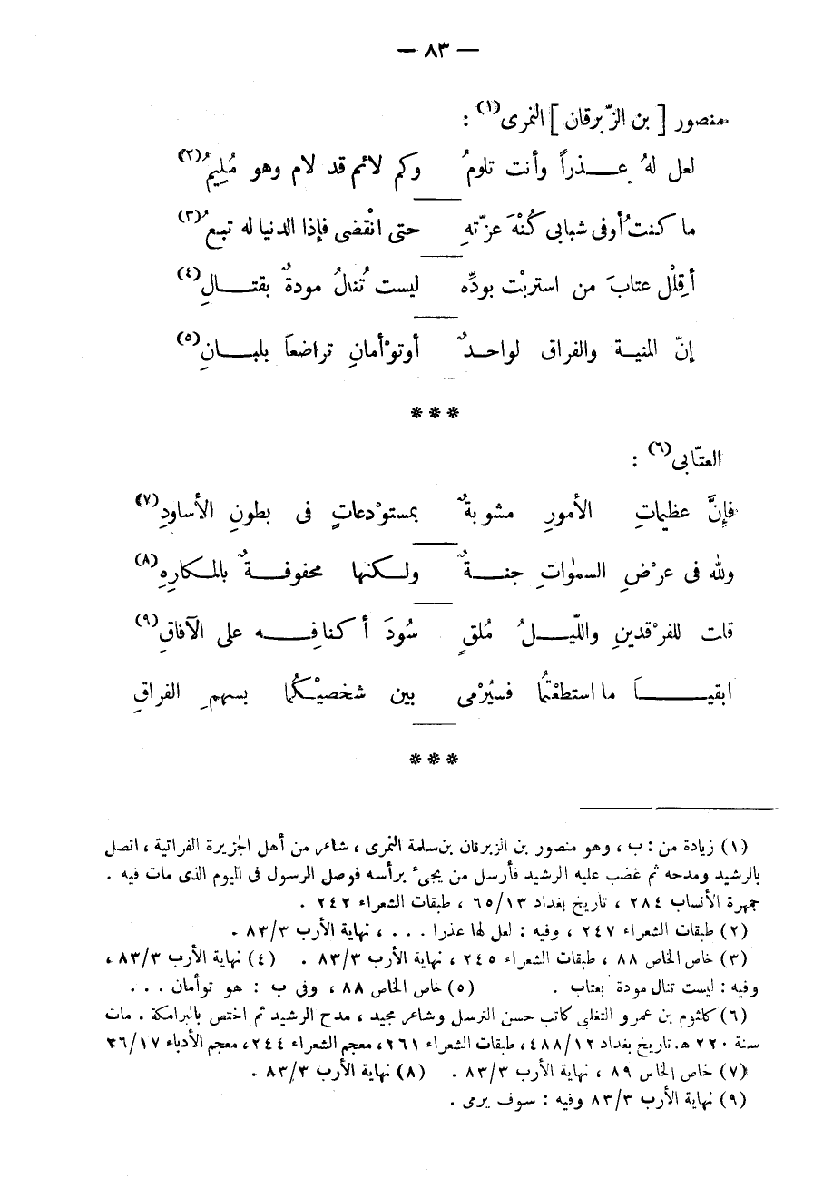 قلت للفرقدين والّليل ملقٍ ... سود أكنافه على الآفاق