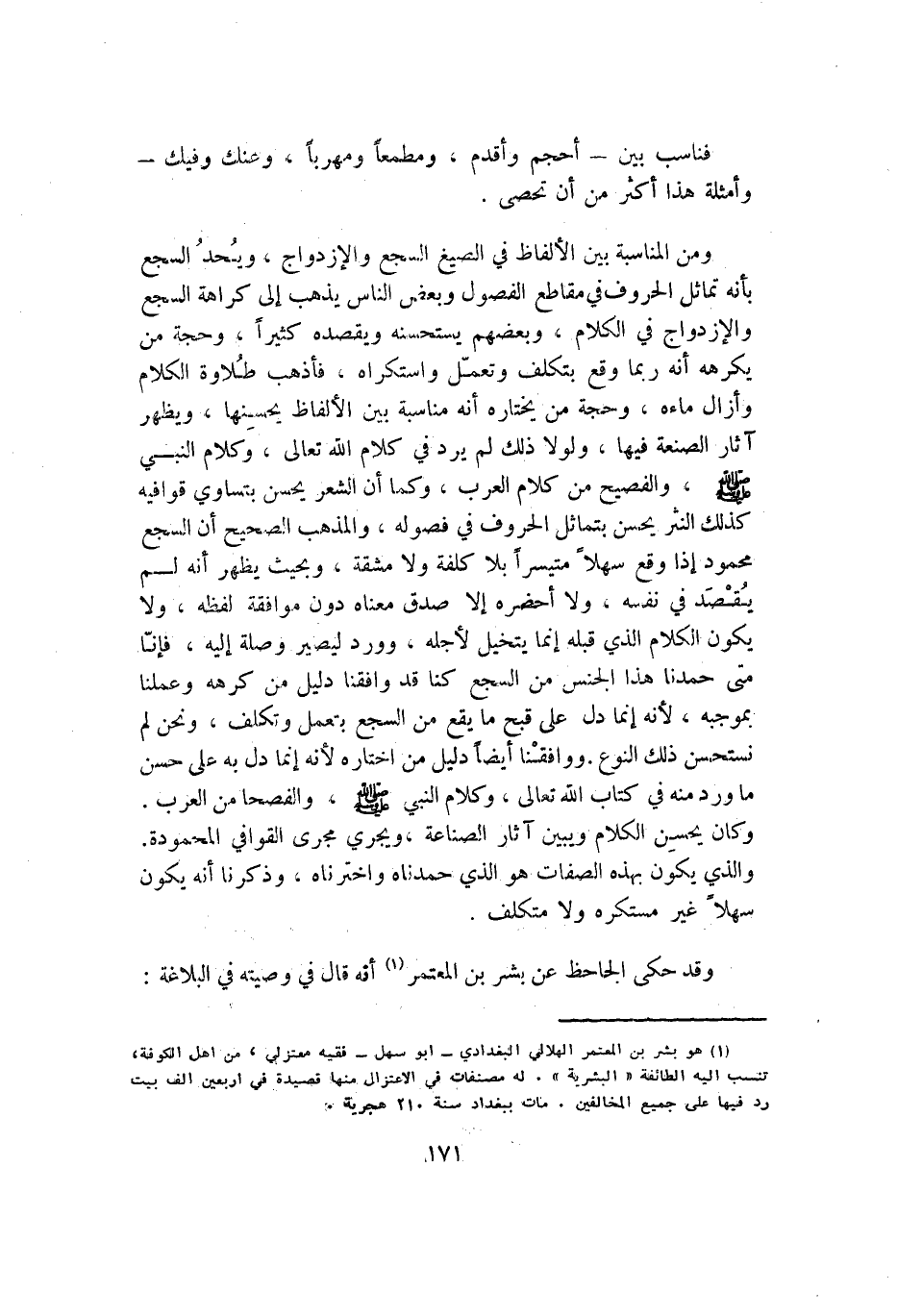 ونحن لم نستحسن ذلك النوع ووافقنا أيضاً دليل من اختاره لأنه إنما دل به على حسن ما ورد منه في كتاب الله تعالى وكلام النبي صلى الله عليه وسلم والفصحاء من العرب. وكان يحسن الكلام ويبين آثار الصناعة ويجرى مجرى القوافي المحمودة والذي يكون بهذه الصفات هو الذي حمدناه واخترناه وذكرنا أنه يكون سهلاً غير مستكره ولا متكلف.