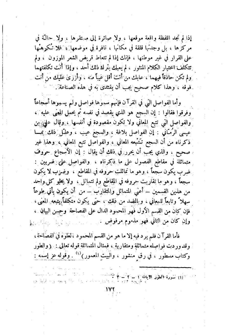 فأما القرآن فلم يرد فيه إلا ما هو من القسم المحمود لعلوه في الفصاحة وقد وردت فواصله متماثلة ومتقاربة فمثال المتماثلة قوله تعالى: {وَالطُّورِ وَكِتَابٍ مَسْطُورٍ فِي رَقٍّ مَنْشُورٍ وَالْبَيْتِ الْمَعْمُورِ} 1 وقوله عز اسمه: {طه مَا أَنْزَلْنَا عَلَيْكَ الْقُرْآنَ لِتَشْقَى إِلَّا تَذْكِرَةً لِمَنْ يَخْشَى تَنْزِيلاً مِمَّنْ مِمَّنْ خَلَقَ الْأَرْضَ وَالسَّمَاوَاتِ الْعُلَى الرَّحْمَنُ عَلَى الْعَرْشِ اسْتَوَى} 2
