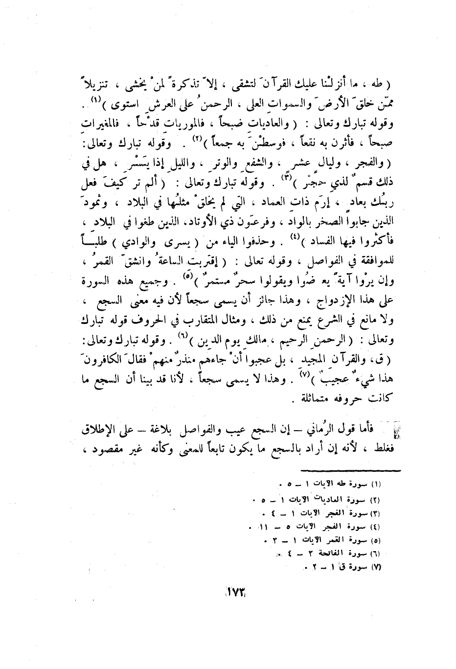 فأما قول الرماني: أن السجع عيب والفواصل بلاغة على الاطلاق فغلط لأنه إن أراد بالسجع ما يكون تابعاً للمعنى وكأنه غير مقصود