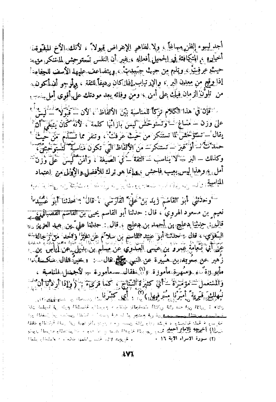 وحدثني أبو القاسم زيد بن علي الفارسي قال حدثنا أبو عبيد نعيم بن مسعود الهروي قال حدثنا أبو القاسم يحيى بن القاسم القصباني قال حدثنا دعلج بن أحمد بن دعلج قال حدثنا على بن عبد العزيز البغوي قال حدثنا أبو عبيد القاسم بن سلام عن غير واحد من رجاله عن أبي نعامة عمرو بن عيسى العدوى عن مسلم بن بديل عن إياس بن زهير عن سويد بن هبيرة عن النبي صلى الله عليه وسلم قال: "خير المال سكة مأبورة ومهرة مأمورة " 1. فقال: مأمورة لأجل المناسبة والمستعمل مومرة أي كثيرة النتاج كما قرئ: {وَإِذَا أَرَدْنَا أَنْ نُهْلِكَ قَرْيَةً أَمَرْنَا مُتْرَفِيهَا} 2 أي كثرنا.