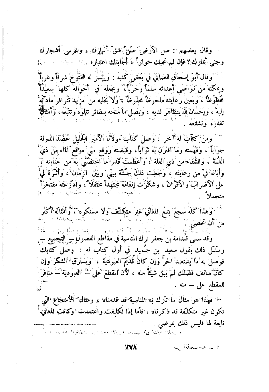 وقد سمى قدامة بن جعفر ترك المناسبة في مقاطع الفصول: التجميع ومثل ذلك بقول سعيد بن حميد في أول كتاب له: وصل كتابك فوصل به ما يستعبد الحر وإن كان قديم العبودية ويستغرق الشكر وإن كان سالف فضلك لم يبق شيئاً منه لأن المقطع على العبودية منافر للمقطع على منه.