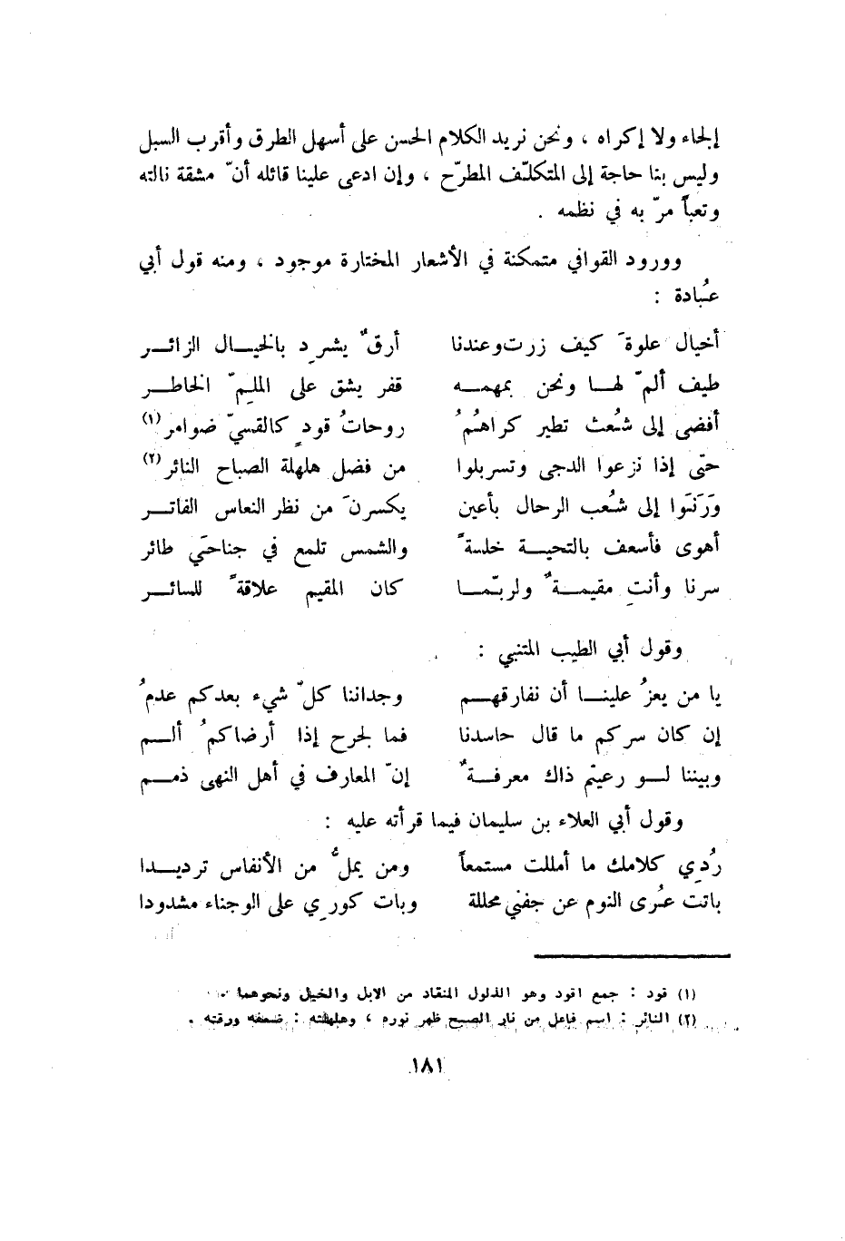 الجاء ولا إكراه. ونحن نريد الكلام الحسن على أسهل الطرق واقرب السبل وليس بنا حاجة إلى المتكلف المطرح وإن ادعي علينا قائلة أن مشقة نالته وتعباً مر به في نظمه.
