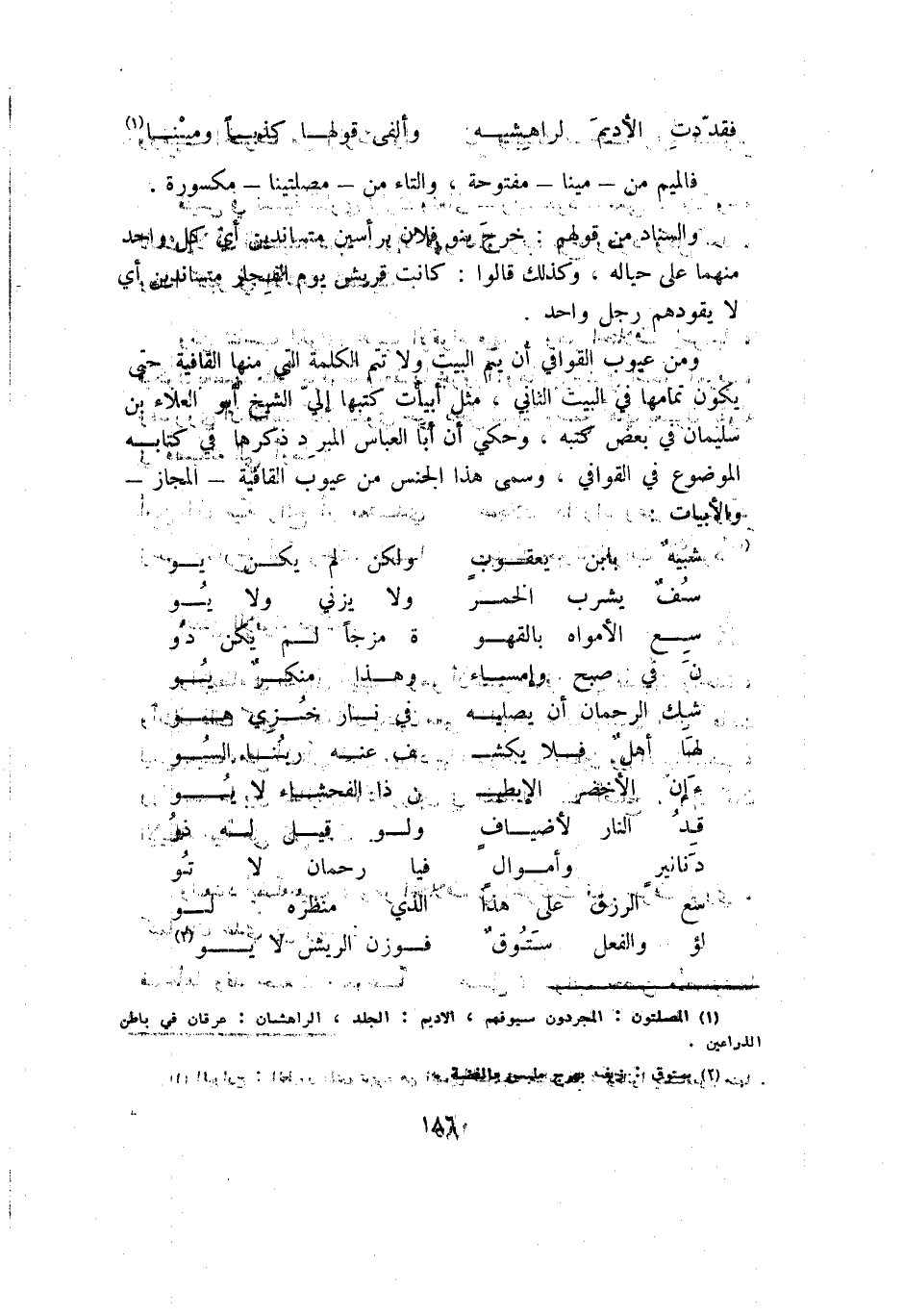 ومن عيوب القوافي: أن يتم البيت ولا تتم الكلمة التي منها القافية حتى يكون تمامها في البيت الثاني مثل أبيات كتبها إلى الشيخ أبو العلاء بن سليمان في بعض كتبه وحكى أن أبا العباس المبرد ذكرها في كتابه الموضوع في القوافي وسمى هذا الجنس من عيوب القافيه المجاز والأبيات: