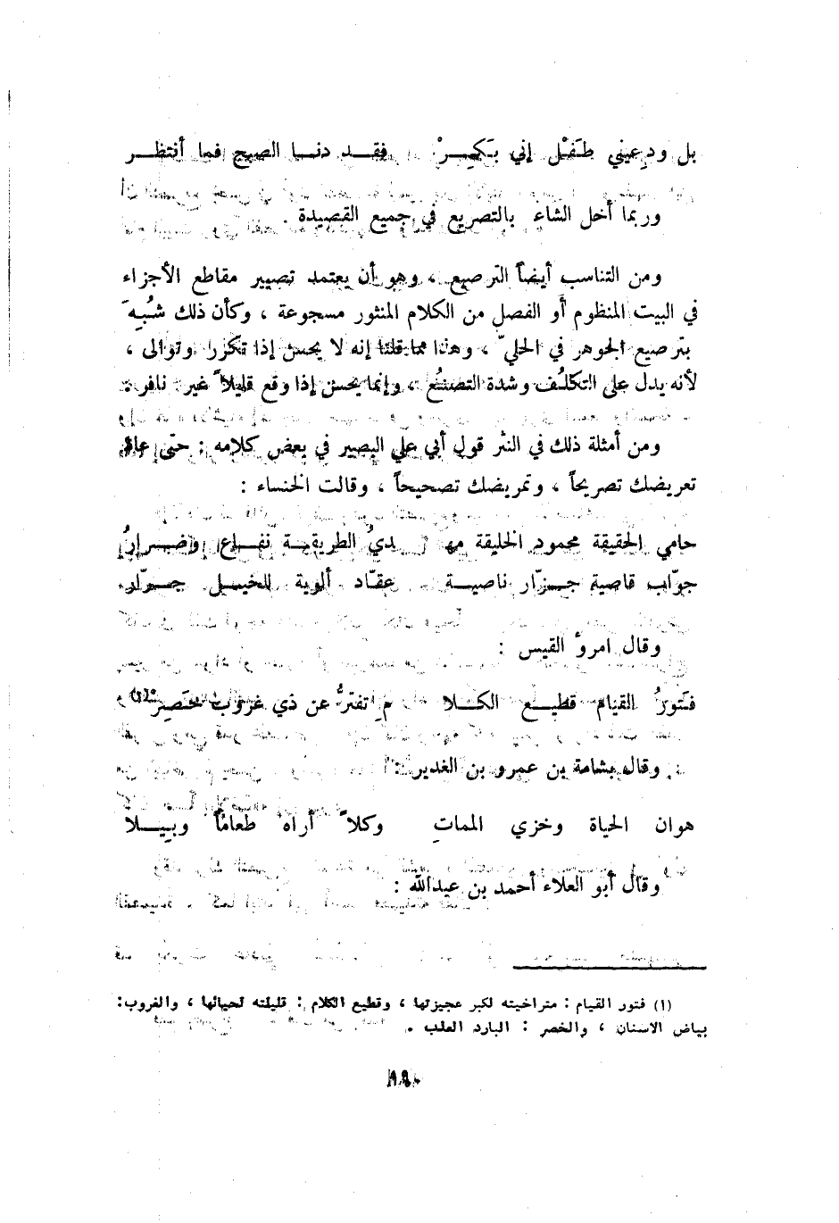 ومن أمثلة ذلك في النثر قول أبي على البصير في بعض كلامه: حتى عاد تعريضك تصريحاً وتمريضك تصحيحاً. وقالت الخنساء: