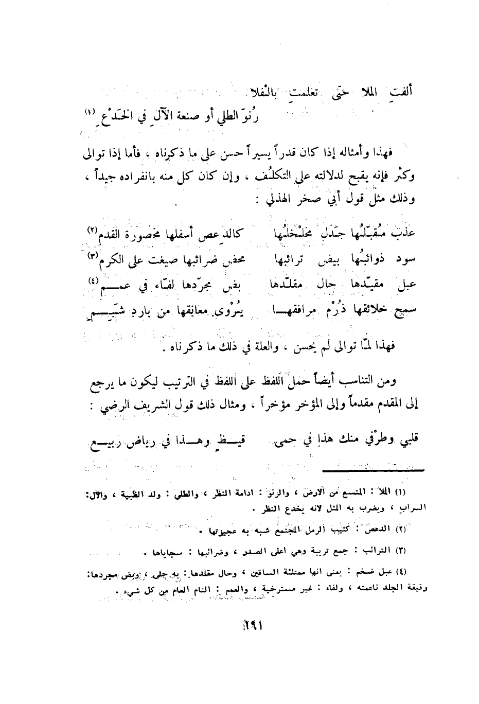 فهذا وأمثاله إذا كان قدراً يسيراً حسن على ما ذكرناه فأما إذا توالى وكثر فإنه يقبح لدلالته على التكلف وإن كان كل منه بانفراده جيداً وذلك مثل قول أبي صخر الهزلي: