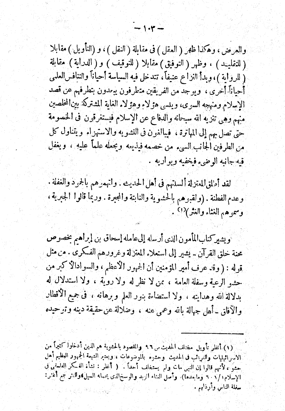 والعرض، وهكذا ظهر (العقل) في مقابلة (النقل)، و (التأويل) مقابلاً لـ (التقليد)، وظهر (التوفيق) و (الدراية) مقابلة لـ (الرواية)، وبدأ النزاع عنيفًا، تتدخل فيه السياسة أحيانًا والتنافس العلمي أحيانًا أخرى، ويوجد من الفريقين متطرفون يبعدون بتطرفهم عن قصد الإسلام وَمَنْهَجِهِ السَّوِيِّ، وينسى هؤلاء وهؤلاء الغاية المشتركة بين المخلصين منهم وهي تنزيه الله سبحانه والدفاع عن الإسلام فيستغرقون في الخصومة حتى تصل بهم إلى المُهاترة، فيبالغون في التشويه والاستهزاء ويتناول كل من الطرفين الجانب السيء من خصمه فيذيعه ويجعله عَلَمًا عَلَيْهِ، ويغفل فيه جانبه الوضيء ويواريه.