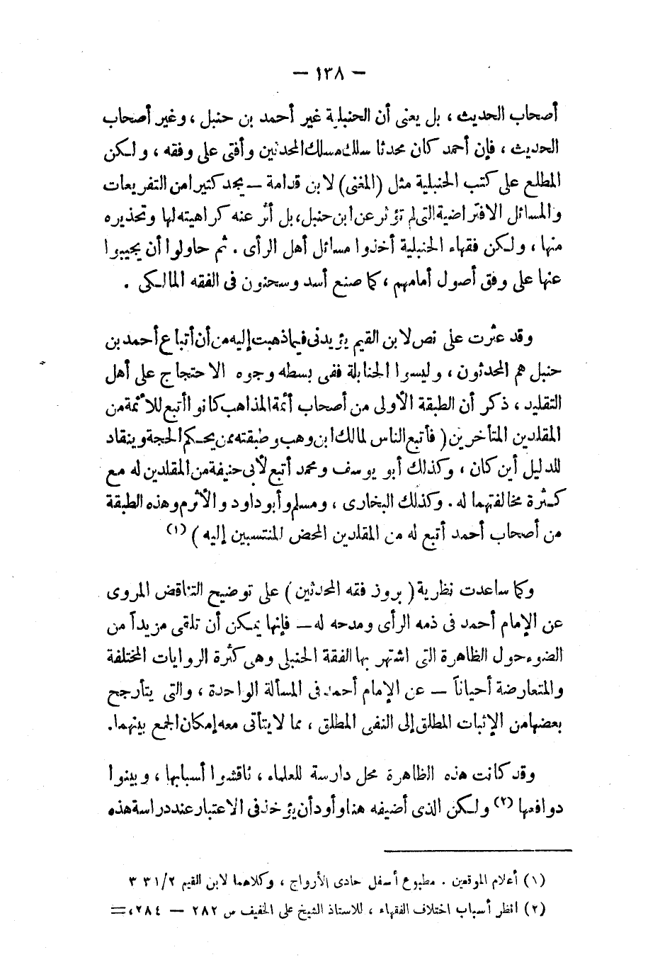 وقد عثرت على نص لابن القيم يؤيدني فيما ذهبت إليه من أن أتباع أحمد بن حنبل هم المحدثون، وليسوا الحنابلة ففي بسطه وجوه الاحتجاج على أهل التقليد، ذكر أن الطبقة الأولى من أصحاب أئمة المذاهب كانوا أتبع للأئمة من المقلدين المتأخيرن «فَأَتْبَعُ النَّاسِ لِمَالِكٍ ابْنُ وَهْبٍ وَطَبَقَتُهُ مِمَّنْ يُحَكِّمُ الحُجَّةَ وَيَنْقَادُ لِلدَّلِيلِ أَيْنَ كَانَ، وَكَذَلِكَ أَبُو يُوسُفَ وَمُحَمَّدٌ أَتْبَعُ لأَبِي حَنِيفَةَ مِنْ المُقَلِّدِينَ لَهُ مَعَ كَثْرَةِ مُخَالَفَتِهِمَا لَهُ، وَكَذَلِكَ البُخَارِيُّ وَمُسْلِمٌ وَأَبُو دَاوُد وَالأَثْرَمُ وَهَذِهِ الطَّبَقَةُ مِنْ أَصْحَابِ أَحْمَدَ أَتْبَعُ لَهُ مِنْ المُقَلِّدِينَ المَحْضِ المُنْتَسِبِينَ إلَيْهِ» (¬1).