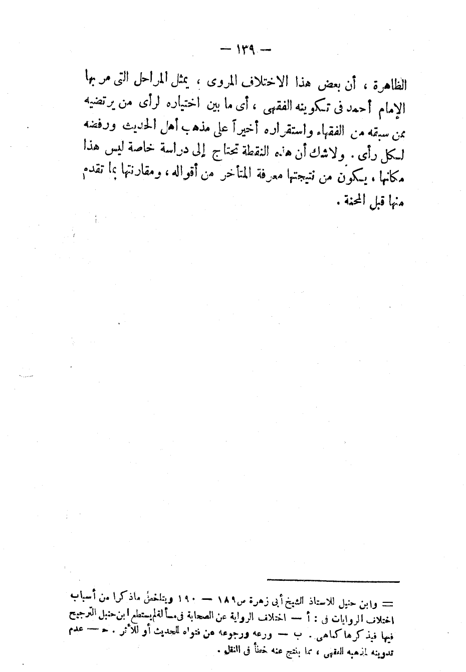 الظاهرة، أن بعض هذا الاختلاف المروي، يمثل المراحل التي مر بها الإمام أحمد في تكوينه الفقهي، أي ما بين اختياره لرأي من يرتضيه ممن سبقه من الفقهاء واستقراره أخيرًا على مذهب أهل الحديث ورفضه لكل رأي. ولا شك أن هذه النقطة تحتاج إلى دراسة خاصة ليس هذا مكانها، يكون من نتيجتها معرفة المتأخر من أقواله، ومقارنتها بما تقدم منها قبل المحنة.