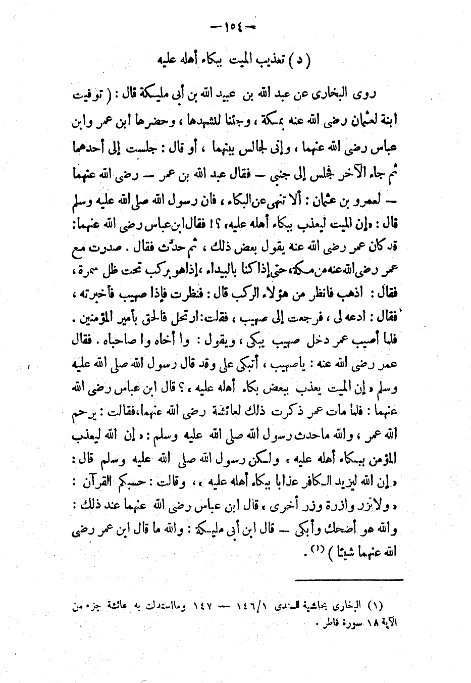 رَوَى البُخَارِيُّ عَنْ عَبْدُ اللَّهِ بْنُ عُبَيْدِ اللَّهِ بْنِ أَبِي مُلَيْكَةَ، قَالَ: تُوُفِّيَتْ ابْنَةٌ لِعُثْمَانَ - رَضِيَ اللهُ عَنْهُ - بِمَكَّةَ، وَجِئْنَا لِنَشْهَدَهَا، وَحَضَرَهَا ابْنُ عُمَرَ وَابْنُ عَبَّاسٍ - رَضِيَ اللهُ عَنْهُمْ -، وَإِنِّي لَجَالِسٌ بَيْنَهُمَا - أَوْ قَالَ: جَلَسْتُ إِلَى أَحَدِهِمَا، ثُمَّ جَاءَ الآخَرُ فَجَلَسَ إِلَى جَنْبِي - فَقَالَ عَبْدُ اللَّهِ بْنُ عُمَرَ - رَضِيَ اللَّهُ عَنْهُمَا - لِعَمْرِو بْنِ عُثْمَانَ: أَلَا تَنْهَى عَنِ البُكَاءِ فَإِنَّ رَسُولَ اللَّهِ - صَلَّى اللهُ عَلَيْهِ وَسَلَّمَ - قَالَ: «إِنَّ المَيِّتَ لَيُعَذَّبُ بِبُكَاءِ أَهْلِهِ عَلَيْهِ»، فَقَالَ ابْنُ عَبَّاسٍ - رَضِيَ اللَّهُ عَنْهُمَا -: قَدْ كَانَ عُمَرُ - رَضِيَ اللهُ عَنْهُ - يَقُولُ بَعْضَ ذَلِكَ، ثُمَّ حَدَّثَ، قَالَ: صَدَرْتُ مَعَ عُمَرَ رَضِيَ اللَّهُ عَنْهُ مِنْ مَكَّةَ، حَتَّى إِذَا كُنَّا بِالبَيْدَاءِ إِذَا هُوَ بِرَكْبٍ تَحْتَ ظِلِّ سَمُرَةٍ، فَقَالَ: اذْهَبْ، فَانْظُرْ مَنْ هَؤُلاَءِ الرَّكْبُ، قَالَ: فَنَظَرْتُ فَإِذَا صُهَيْبٌ، فَأَخْبَرْتُهُ فَقَالَ: ادْعُهُ لِي، فَرَجَعْتُ إِلَى صُهَيْبٍ فَقُلْتُ: ارْتَحِلْ فَالحَقْ أَمِيرَ المُؤْمِنِينَ، فَلَمَّا أُصِيبَ عُمَرُ دَخَلَ صُهَيْبٌ يَبْكِي يَقُولُ: وَا أَخَاهُ وَا صَاحِبَاهُ، فَقَالَ عُمَرُ - رَضِيَ اللَّهُ عَنْهُ -: يَا صُهَيْبُ، أَتَبْكِي عَلَيَّ، وَقَدْ قَالَ رَسُولُ اللَّهِ صَلَّى اللهُ عَلَيْهِ وَسَلَّمَ: «إِنَّ المَيِّتَ يُعَذَّبُ بِبَعْضِ بُكَاءِ أَهْلِهِ عَلَيْهِ؟»، قَالَ ابْنُ عَبَّاسٍ - رَضِيَ اللَّهُ عَنْهُمَا -: فَلَمَّا مَاتَ عُمَرُ - رَضِيَ اللَّهُ عَنْهُ -، ذَكَرْتُ ذَلِكَ لِعَائِشَةَ - رَضِيَ اللَّهُ عَنْهَا -، فَقَالَتْ: رَحِمَ اللَّهُ عُمَرَ، وَاللَّهِ مَا حَدَّثَ رَسُولُ اللَّهِ - صَلَّى اللهُ عَلَيْهِ وَسَلَّمَ -: «إِنَّ اللَّهَ لَيُعَذِّبُ المُؤْمِنَ بِبُكَاءِ أَهْلِهِ عَلَيْهِ»، وَلَكِنَّ رَسُولَ اللَّهِ - صَلَّى اللهُ عَلَيْهِ وَسَلَّمَ - قَالَ: «إِنَّ اللَّهَ لَيَزِيدُ الكَافِرَ عَذَابًا بِبُكَاءِ أَهْلِهِ عَلَيْهِ»، وَقَالَتْ: حَسْبُكُمُ القُرْآنُ: {وَلاَ تَزِرُ وَازِرَةٌ وِزْرَ أُخْرَى} [الأنعام: 164]. قَالَ ابْنُ عَبَّاسٍ - رَضِيَ اللَّهُ عَنْهُمَا -: «عِنْدَ ذَلِكَ، وَاللَّهُ هُوَ أَضْحَكَ وَأَبْكَى» قَالَ ابْنُ أَبِي مُلَيْكَةَ: «وَاللَّهِ مَا قَالَ ابْنُ عُمَرَ - رَضِيَ اللَّهُ عَنْهُمَا - شَيْئًا» (¬1).