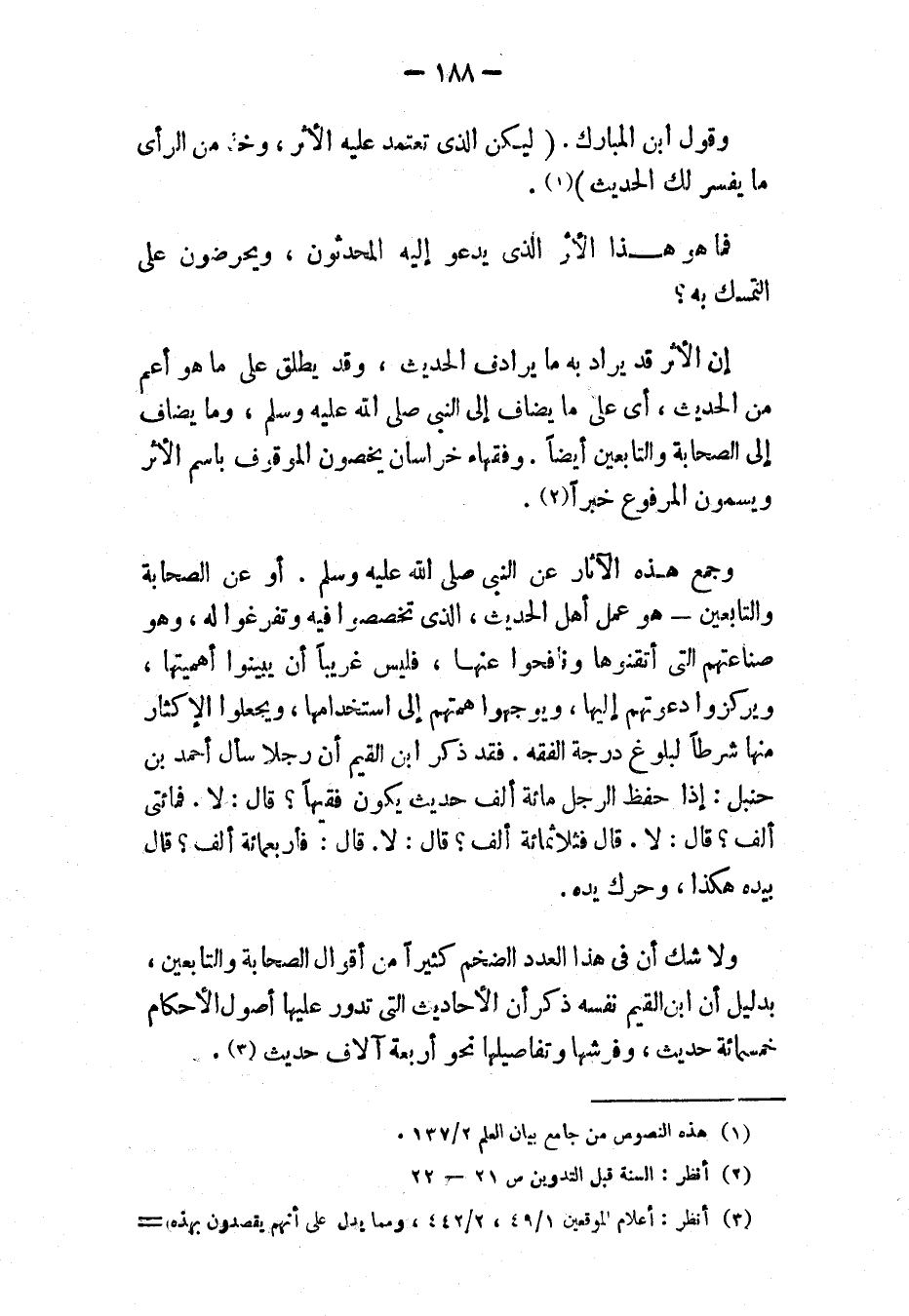 وجمع هذه الآثار عن النبي - صَلَّى اللهُ عَلَيْهِ وَسَلَّمَ -. أو عن الصحابة والتابعين، هو عمل أهل الحديث، الذي تخصصوا فيه وتفرغوا له، وهو صناعتهم التي أتقنوها ونافحوا عنها، فليس غريبًا أن يبينوا أهميتها، ويركزوا دعوتهم إليها، ويوجهوا همتهم إلى استخدامها، ويجعلوا الإكثار منها شرطًا لبلوغ درجة الفقه. فقد ذكر ابن القيم أَنَّ رَجُلاً سَأَلَ أَحْمَدَ بْنَ حَنْبَلٍ: «إذَا حَفِظَ الرَّجُلُ مِائَةَ أَلْفِ حَدِيثٍ يَكُونُ فَقِيهًا؟ قَالَ: " لاَ "، قَالَ: " فَمِائَتَيْ أَلْفٍ؟ " قَالَ: " لاَ "، قَالَ: " فَثَلاَثَ مِائَةِ أَلْفٍ؟ " قَالَ: " لاَ "، قَالَ: " فَأَرْبَعَ مِائَةِ أَلْفٍ "، قَالَ بِيَدِهِ هَكَذَا، وَحَرَّكَ يَدَهُ».