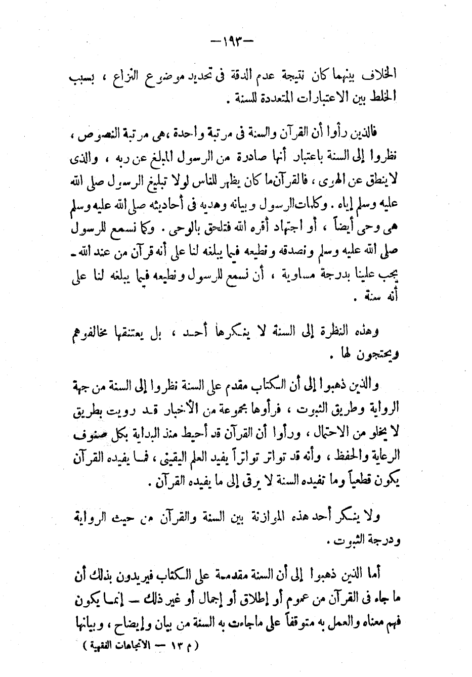 فالذين رأوا أن القرآن والسنة في مرتبة واحدة، هي مرتبة النصوص، نظروا إلى السنة باعتبار أنها صادرة من الرسول المبلغ عن ربه، والذي لا ينطق عن الهوى، فالقرآن ما كان يظهر للناس لولا تبليغ الرسول - صَلَّى اللهُ عَلَيْهِ وَسَلَّمَ - إياه. وكلمات الرسول وبيانه وهديه في أحاديثه - صَلَّى اللهُ عَلَيْهِ وَسَلَّمَ - هي وحي أيضًا، أو اجتهاد أقره الله فتلحق بالوحي. وكما نسمع للرسول - صَلَّى اللهُ عَلَيْهِ وَسَلَّمَ - ونصدقه ونطيعه فيما يبلغه لنا على أنه قرآن من عند الله يجب علينا بدرجة مساوية، أن نسمع للرسول ونطيعه فيما يبلغه لنا على أنه سنة.