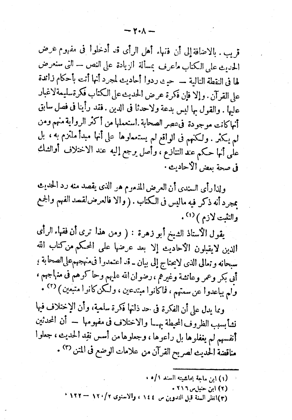 قريب. بالإضافة إلى فقهاء أهل الرأي قد أدخلوا في مفهوم عرض الحديث على الكتاب ما عرف بمسألة الزيادة على النص - التي سنعرض لها في النقطة التالية - حين ردوا أحاديث لمجرد أنها أتت بأحكام زائدة على القرآن، وإلا فإن فكرة عرض الحديث على الكتاب فكرة سليمة لا غبار عليها. والقول بها ليس بدعة ولا حدثًا في الدين. فقد رأينا في فصل سابق أنها كانت موجودة في عصر الصحابة. استعملها من أكثر الرواية منهم ومن لم يكثر، ولكنهم في الواقع لم يستعملوها على أنها مبدأ ملتزم به، بل على أنها حكم عند التنازع، وأصل يرجع إليه عند الاختلاف أو الشك في صحة بعض الأحاديث.
