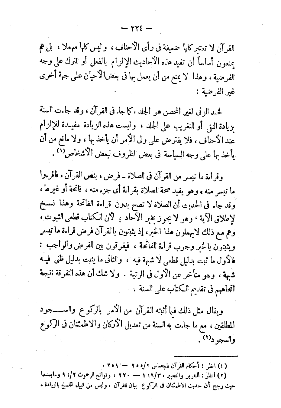 وقراءة ما تيسر من القرآن في الصلاة فرض بنص القرآن {فَاقْرَءُوا مَا تَيَسَّرَ مِنْهُ} [المزمل: 20]، وهو يفيد صحة الصلاة بقراءة أي جزء منه، فاتحة أو غيرها، وقد جاء في الحديث أن الصلاة لا تصح بدون قراءة الفاتحة، وهذا نسخ لإطلاق الآية، وهو لا يجوز بخبر الآحاد، لأن الكتاب قطعي الثبوت، وهم مع ذلك لا يهملون هذا الخبر، إذ يثبتون بالقرآن فرض قراءة ما تيسر ويثبتون بالخبر وجوب قراءة الفاتحة، فيفرقون بين الفرض والواجب: فالأول ما ثبت بدليل قطعي لا شبهة فيه، والثاني ما يثبت بدليل ظني فيه شبهة، وهو متأخر عن الأول في الرتبة. ولا شك أن هذه التفرقة نتيجة اتجاههم في تقديم الكتاب على السنة.