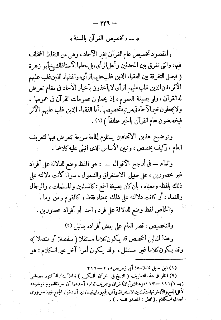 والمقصود تخصيص عام القرآن بخبر الآحاد، وهي من النقاط المختلف فيها، والتي تفرق بين المحدثين وأهل الرأي، بل جعلها الأستاذ أبو زهرة «فَيْصَلَ التَّفْرِقَةِ بَيْنَ الفُقَهَاءِ الذِينَ غَلَبَ عَلَيْهِمْ الرَّأْيُ، وَالفُقَهَاءِ الذِينَ غَلَبَ عَلَيْهِمْ الأَثَرُ، فَإِنَّ الذِينَ غَلَبَ عَلَيْهِمْ الرَّأْيُ لَا يَأْخُذُونَ بِأَخْبَارِ الآحَادِ فِي مَقَامِ تَعَرَّضَ لَهُ القُرْآنُ، وَلَوْ بِصِيغَةِ العُمُومِ، إِذْ يَجْعَلُونَ عُمُومَاتِ القُرْآنِ فِي عُمُومِهَا، وَلَا يَجْعَلُونَ خَبَرَ الآحَادِ فِي مَرْتَبَةِ تَخْصِيصِهَا، أَمَّا الفُقَهَاءُ الذِينَ غَلَبَ عَلَيْهِمْ الأَثَرُ فَيُخَصِّصُونَ عَامَّ القُرْآنَ بِالخَبَرِ مُطْلَقًا» (¬1).
