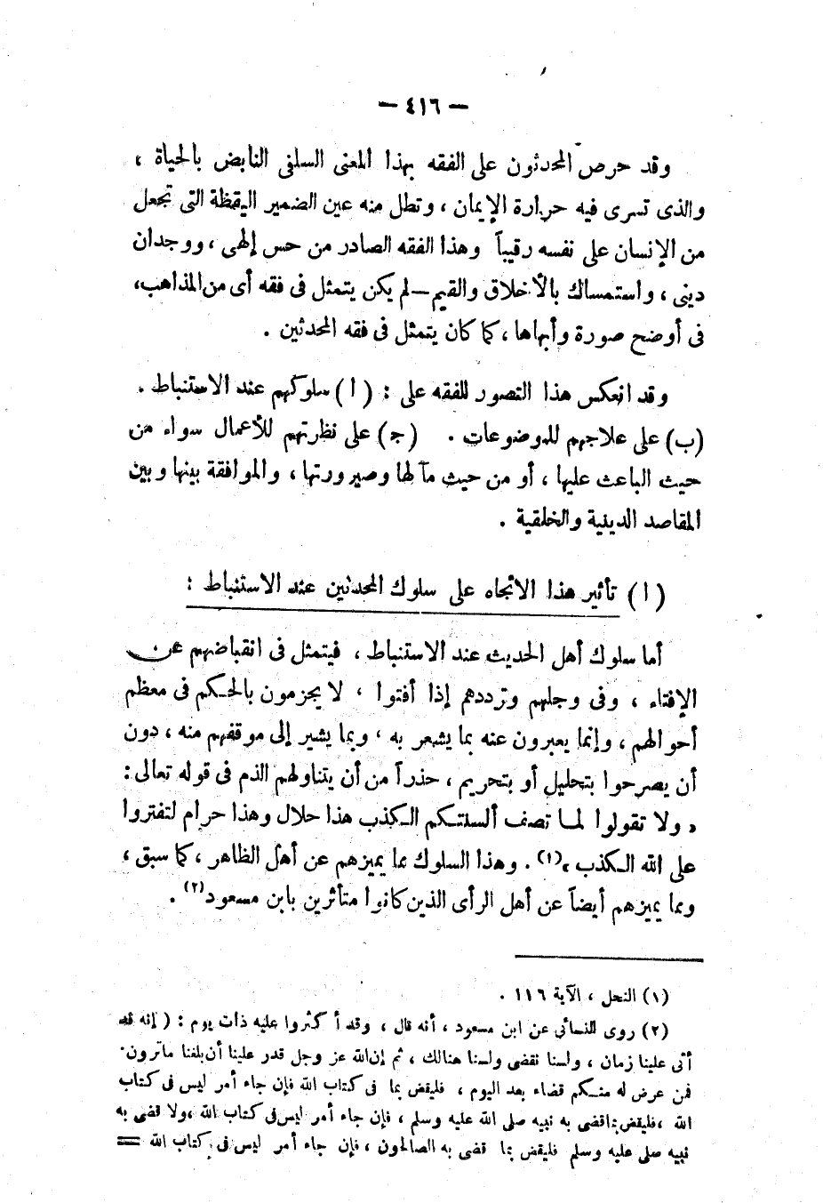 أما سلوك أهل الحديث عند الاستنباط، فيتمثل في انقباضهم عن الإفتاء، وفي وجلهم وترددهم إذا أفتوا، لا يجزمون بالحكم في معظم أحوالهم، وإنما يعبرون عنه بما يشعر به، وبما يشير إلى موقفهم منه، دون أن يصرحوا بتحليل أو بتحريم، حذرًا من أن يتناولهم الذم في قوله تعالى: {وَلَا تَقُولُوا لِمَا تَصِفُ أَلْسِنَتُكُمُ الْكَذِبَ هَذَا حَلَالٌ وَهَذَا حَرَامٌ لِتَفْتَرُوا عَلَى اللَّهِ الْكَذِبَ} (¬1). وهذا السلوك بما يميزهم عن أهل الظاهر، كما سبق، ومما يميزهم أيضًا عن أهل الرأي الذين كانوا متأثرين بابن مسعود (¬2).