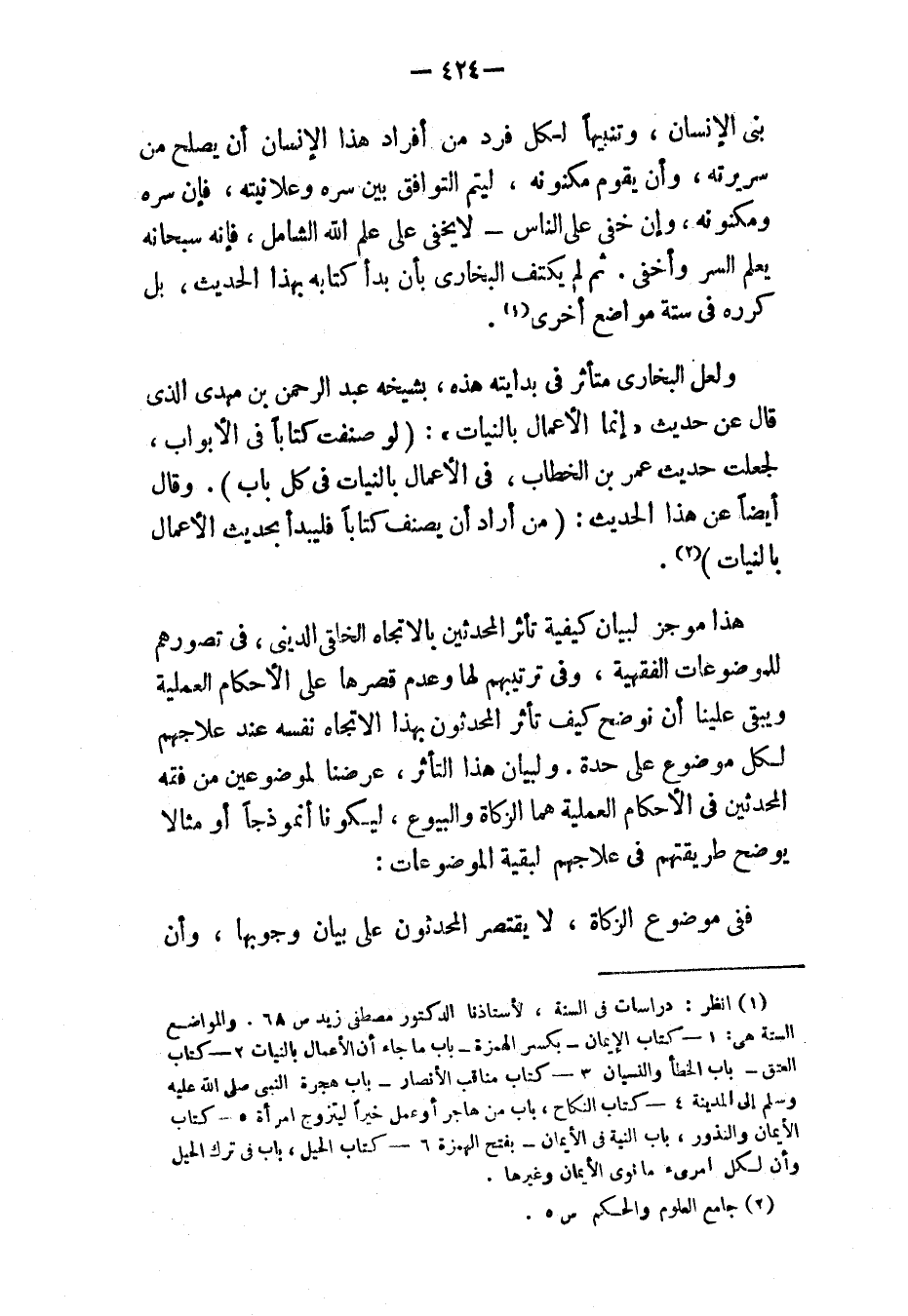 هذا موجز لبيان كيفية تأثر المحدثين بالاتجاه الخلقي الديني، في تصورهم للموضوعات الفقهية، وفي ترتيبهم لها وعدم قصرها على الأحكام العملية ويبقى علينا أن نوضح كيف تأثر المحدثون بهذا الاتجاه نفسه عند علاجهم لكل موضوع على حدة. ولبيان هذا التأثر، عرضنا لموضوعين من فقه المحدثين في الأحكام العملية هما الزكاة والبيوع، ليكونا أنموذجًا أو مثالاً يوضح طريقتهم في علاجهم لبقية الموضوعات: