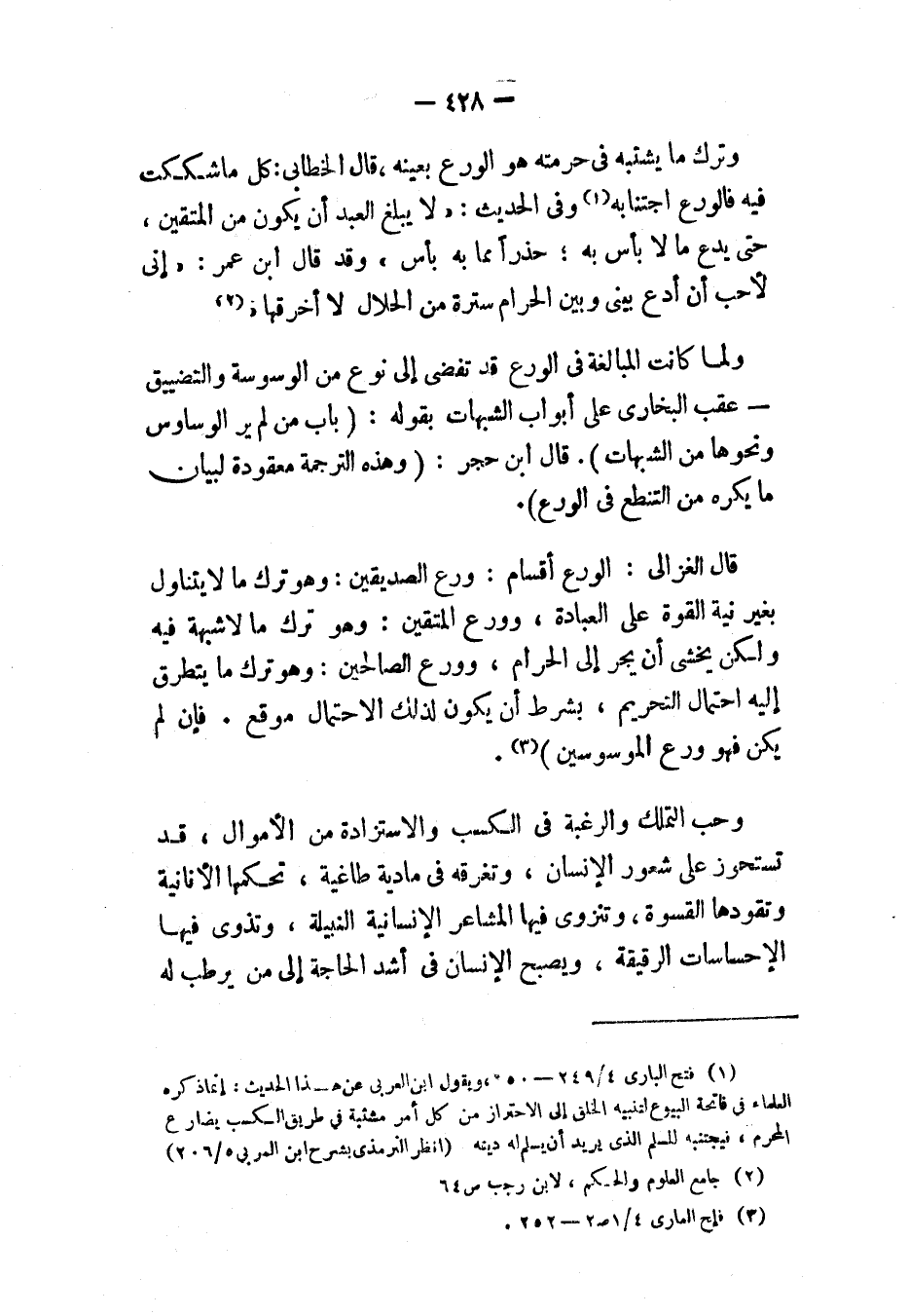 (¬1) " فتح الباري ": 4/ 249، 250، ويقول ابن العربي عن هذا الحديث: «إِنَّمَا ذَكَرَهُ العُلَمَاءُ فِي فَاتِحَةِ البُيُوعِ لِتَنْبِيهِ الخَلْقِ إِلَى الاِحْتِرَازِ مِنْ كُلِّ أَمْرٍ مُشْتَبَهٍ فِي طَرِيقِ الكَسْبِ يُضَارِعُ المُحْرِمُ، فَيَجْتَنِبُهُ المُسْلِمُ الذِي يُرِيدُ أَنْ يُسْلِمَ لَهُ دِينَهُ» (انظر " الترمذي بشرح ابن العربي ": 5/ 206).