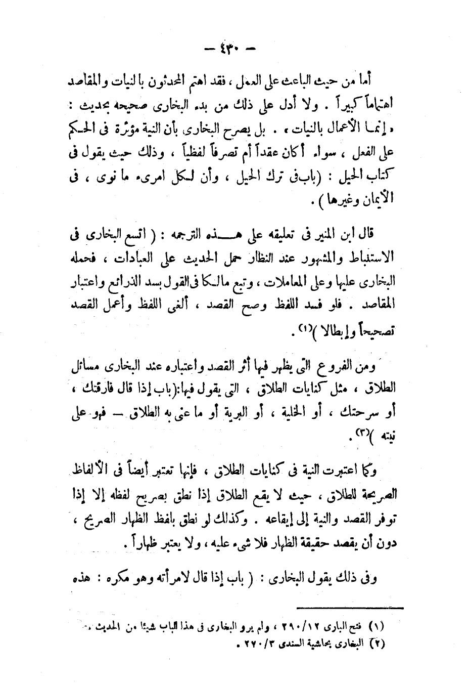 قَالَ ابْنُ المُنَيِّرِ في تعليقه على هذه الترجمة: «اتَّسَعَ البُخَارِيُّ فِي الاِسْتِنْبَاطِ، وَالمَشْهُورُ عِنْدَ النُّظَّارِ حَمْلُ الحَدِيثِ عَلَى العِبَادَاتِ، فَحَمَلَهُ البُخَارِيُّ عَلَيْهَا وَعَلَى المُعَامَلاَتِ، وَتَبِعَ مَالِكًا فِي القَوْلِ بِسَدِّ الذَّرَائِعِ وَاعْتِبَارِ المَقَاصِدِ. فَلَوْ فَسَدَ اللَّفْظُ وَصَحَّ القَصْدُ، أُلْغِيَ اللَّفْظُ وَأُعْمِلَ القَصْدُ تَصْحِيحًا وَإِبْطَالاً» (¬1).