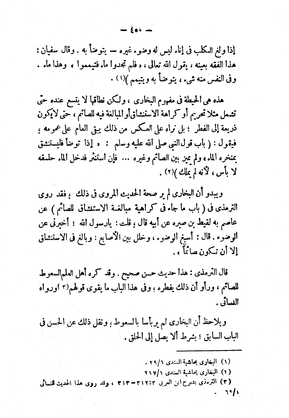 هذه هي الحيطة في مفهوم البخاري، ولكن نطاقها لا يتسع عنده حتى تشمل مثلاً تحريم أو كراهة الاستنشاق أو المبالغة فيه للصائم، حتى لا يكون ذريعة إلى الفطر، بل نراه على العكس من ذلك يبقى العام على عمومه، فيقول: (بَابُ قَوْلِ النَّبِيِّ - صَلَّى اللهُ عَلَيْهِ وَسَلَّمَ -: «إِذَا تَوَضَّأَ، فَلْيَسْتَنْشِقْ بِمَنْخِرِهِ المَاءَ» وَلَمْ يُمَيِّزْ بَيْنَ الصَّائِمِ وَغَيْرِهِ ... فَإِنِ اسْتَنْثَرَ، فَدَخَلَ المَاءُ حَلْقَهُ لاَ بَأْسَ، [لَمْ] يَمْلِكْ) (¬2).