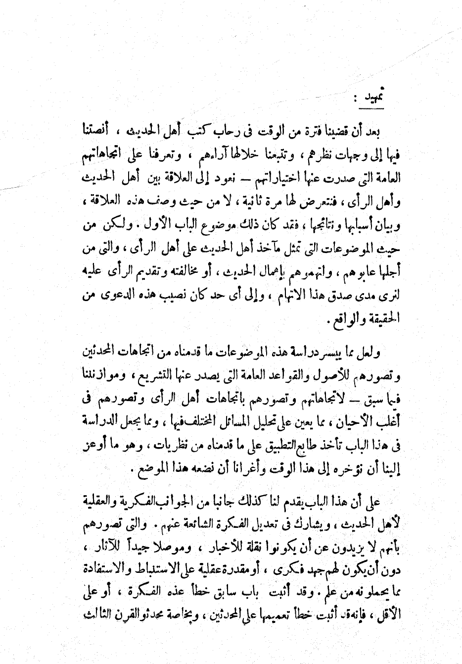 بعد أن قضينا فترة من الوقت في رحاب كتب أهل الحديث، أنصتنا فيها إلى وجهات نظرهم، وتتبعنا خلالها آراءهم، وتعرفنا على اتجاهاتهم العامة التي صدرت عنها اختياراتهم - نعود إلى العلاقة بين أهل الحديث وأهل الرأي، فنتعرض لها مرة ثانية، لا من حيث وصف هذه العلاقة، وبيان أسبابها ونتائجها، فقد كان ذلك موضوع الباب الأول. ولكن من حيث الموضوعات التي تمثل مآخذ أهل الحديث على أهل الرأي، والتي من أجلها عابوهم، واتهموهم بإعمال الحديث، أو مخالفته وتقديم الرأي عليه لترى مدى صدق هذا الاتهام، وإلى أي حد كان نصيب هذه الدعوى من الحقيقة والواقع.