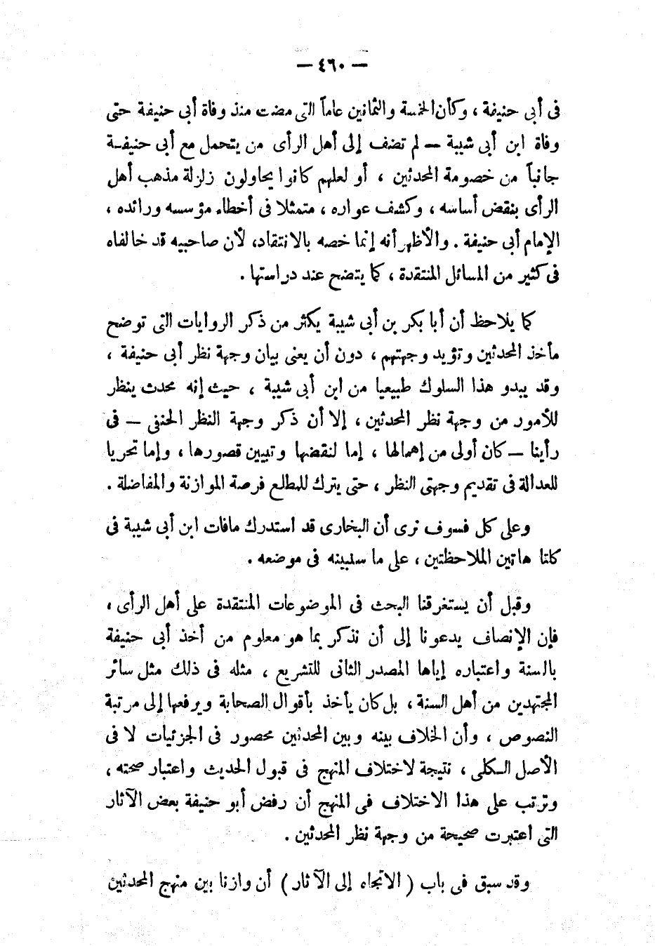في أبي حنيفة، وكأن الخمسة والثمانين عامًا التي مضت منذ وفاة أبي حنيفة حتى وفاة ابن أبي شيبة - لم تضف إلى أهل الرأي من يتحمل مع أبي حنيفة جانبًا من خصومة المحدثين، أو لعلهم كانوا يحاولون زلزلة مذهب أهل الرأي بنقض أساسه، وكشف عواره، متمثلاً في أخطاء مؤسسه ورائده، الإمام أبي حنيفة. والأظهر أنه إنما خصه بالانتقاد، لأن صاحبيه قد خالفاه في كثير من المسائل المنتقدة، كما يتضح عند دراستها.
