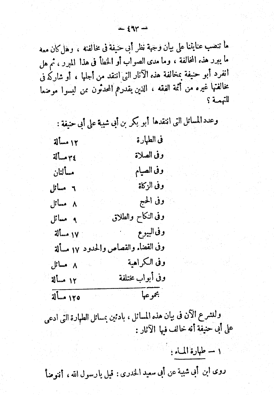 ولنشرع الآن في بيان هذه المسائل، بادئين بمسائل الطهارة التي ادعى على أبي حنيفة أنه خالف فيها الآثار: