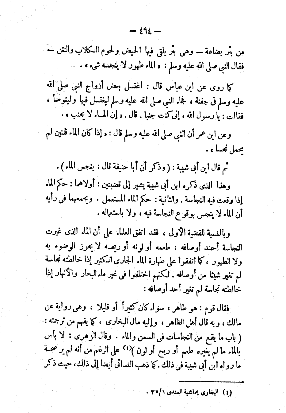 مِنْ بِئْرِ بُضَاعَةَ؟، - وَهِيَ بِئْرٌ يُلْقَى فِيهَا الحِيَضُ وَلُحُومُ الكِلاَبِ وَالنَّتْنُ - فَقَالَ النَّبِيُّ - صَلَّى اللهُ عَلَيْهِ وَسَلَّمَ -: «المَاءُ طَهُورٌ، لَا يُنَجِّسُهُ شَيْءٌ».