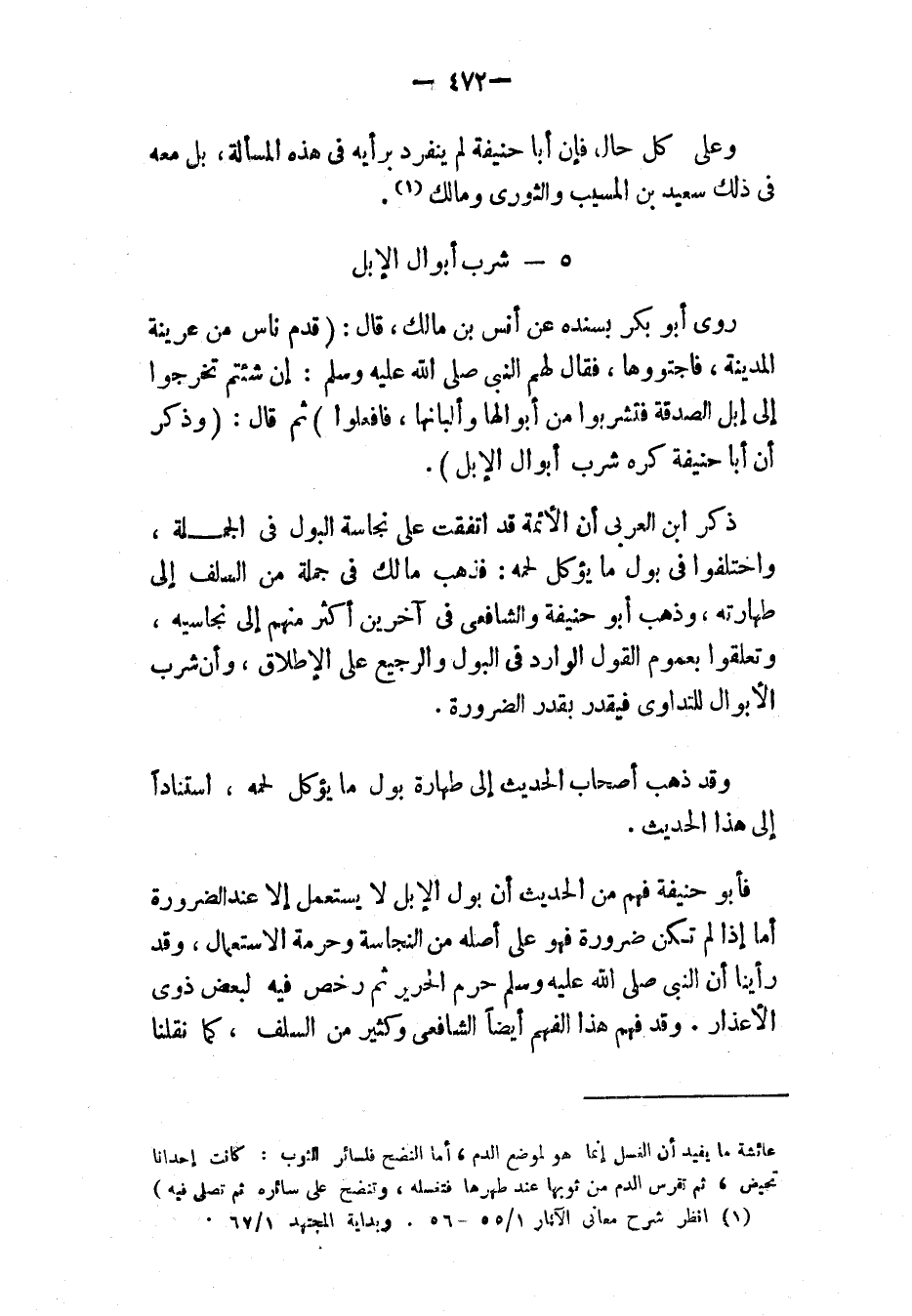 - «وَذُكِرَ أَنَّ أَبَا حَنِيفَةَ كَرِهَ شُرْبَ أَبْوَالِ الإِبِلِ».
