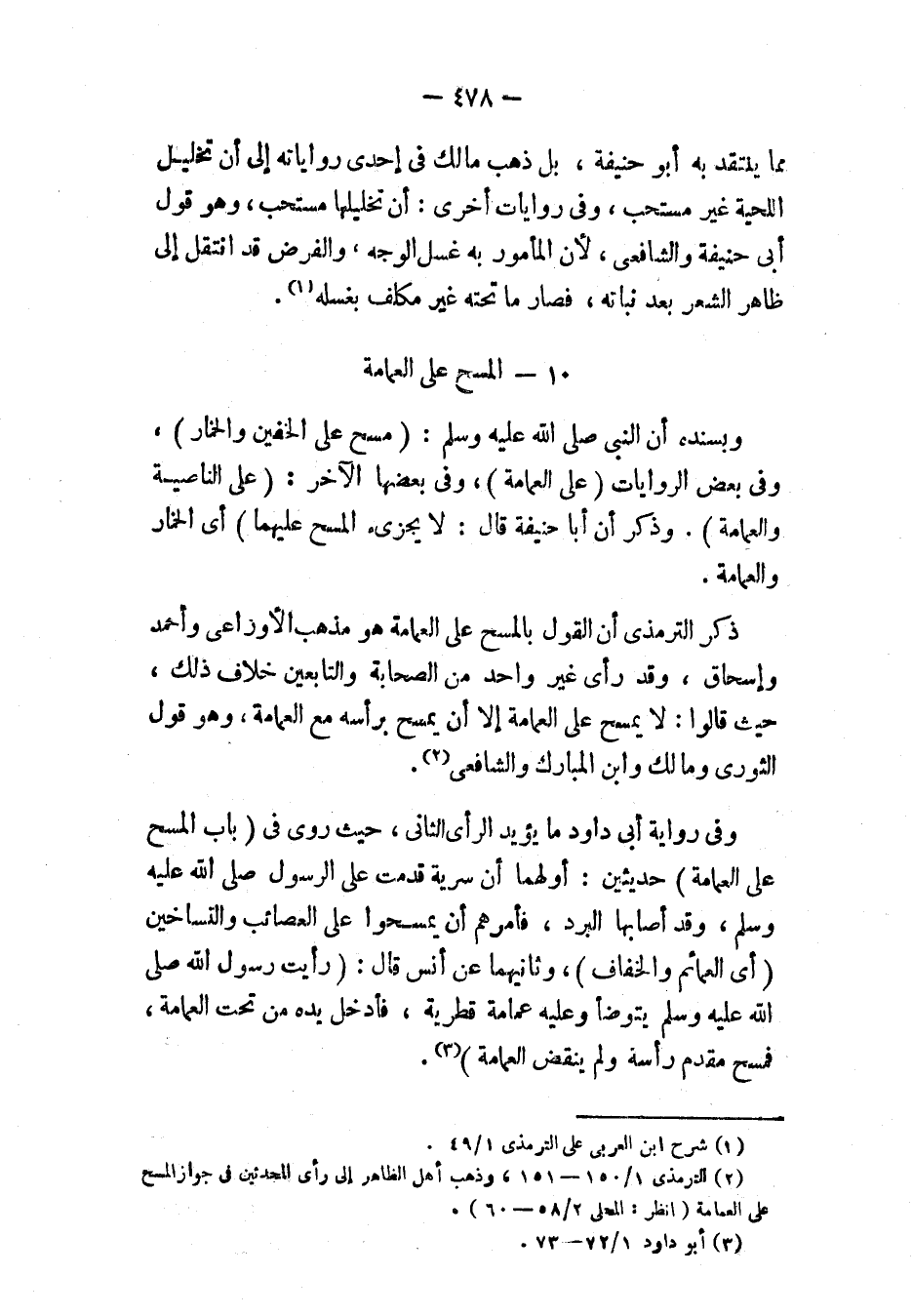 (¬2) " الترمذي ": 1/ 150، 151. وذهب أهل الظاهر إلى رأي المحدثين في جواز المسح على العمامة (انظر: " المحلى ": 2/ 58، 60).