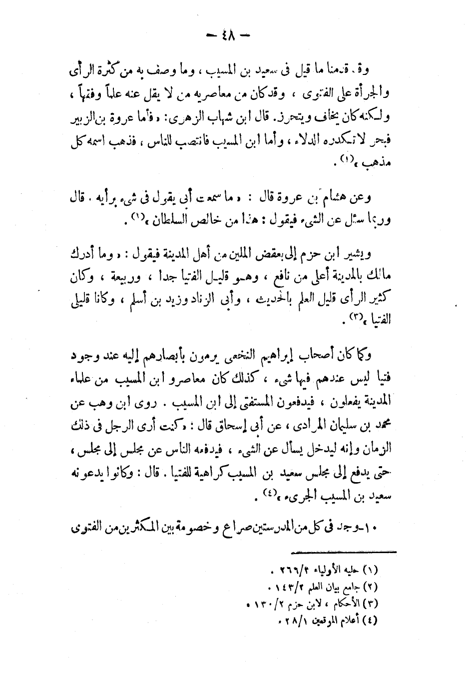وقد قدمنا ما قيل في سعيد بن المسيب، وما وصف به من كثرة الرأي والجُرأة على الفتوى، وقد كان من معاصريه من لا يقل عنه علمًا وفقهًا، ولكنه كان يخاف ويحترز. قَالَ ابْنُ شِهَابٍ الزُّهْرِيُّ: «فَأَمَّا عُرْوَةُ بْنُ الزُّبَيْرِ [فَبِئْرٌ] لَا تُكَدِّرُهُ الدِّلَاءُ، وَأَمَّا [ابْنُ المُسَيَّبِ] فَانْتَصَبَ لِلنَّاسِ، فَذَهَبَ اسْمُهُ كُلَّ مَذْهَبٍ» (¬1).