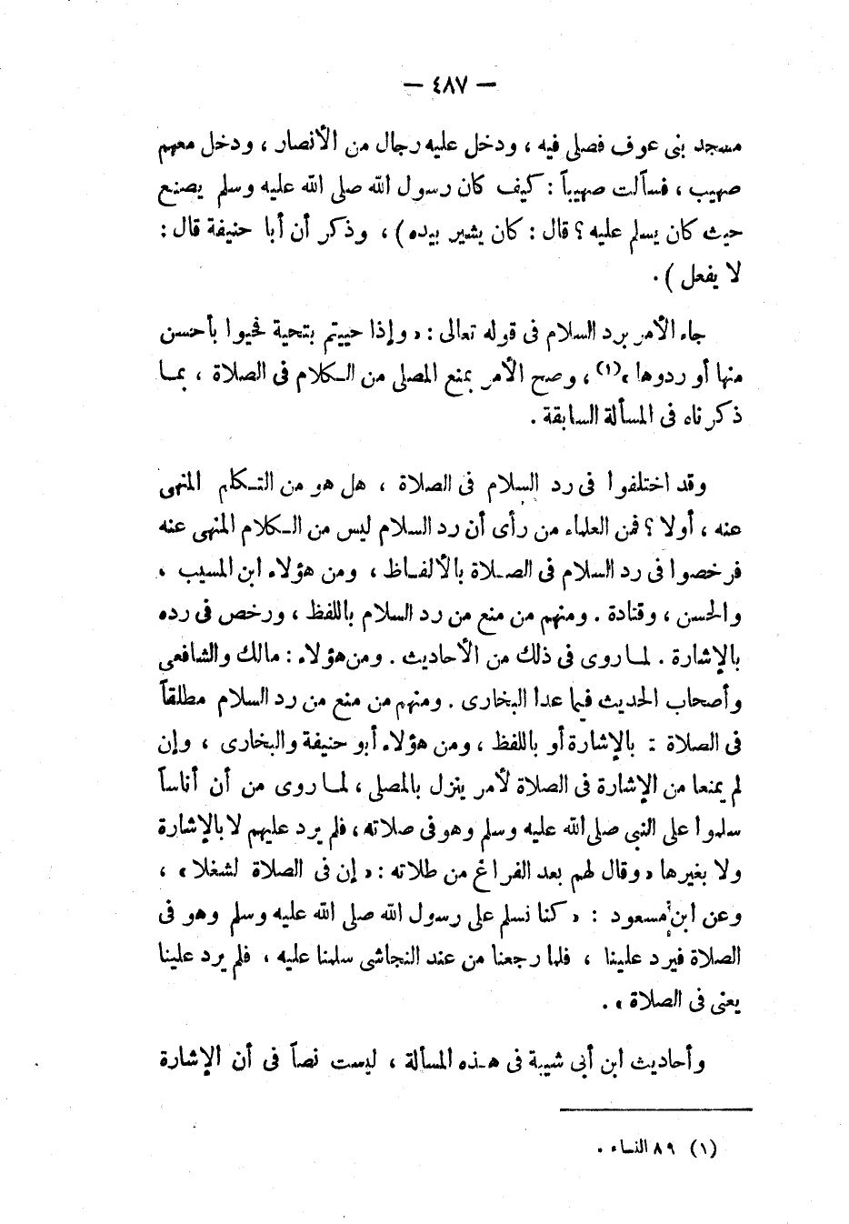 مَسْجِدَ [بَنِي عَمْرِو بْنِ] عَوْفٍ يُصَلِّي فِيهِ , [وَدَخَلَتْ] عَلَيْهِ رِجَالٌ مِنَ الأَنْصَارِ وَدَخَلَ مَعَهُمْ صُهَيْبٌ , فَسَأَلْتُ صُهَيْبًا: " كَيْفَ كَانَ رَسُولُ اللَّهِ - صَلَّى اللهُ عَلَيْهِ وَسَلَّمَ - يَصْنَعُ حَيْثُ كَانَ يُسَلَّمُ عَلَيْهِ؟ " , قَالَ: " كَانَ يُشِيرُ بِيَدِهِ "».