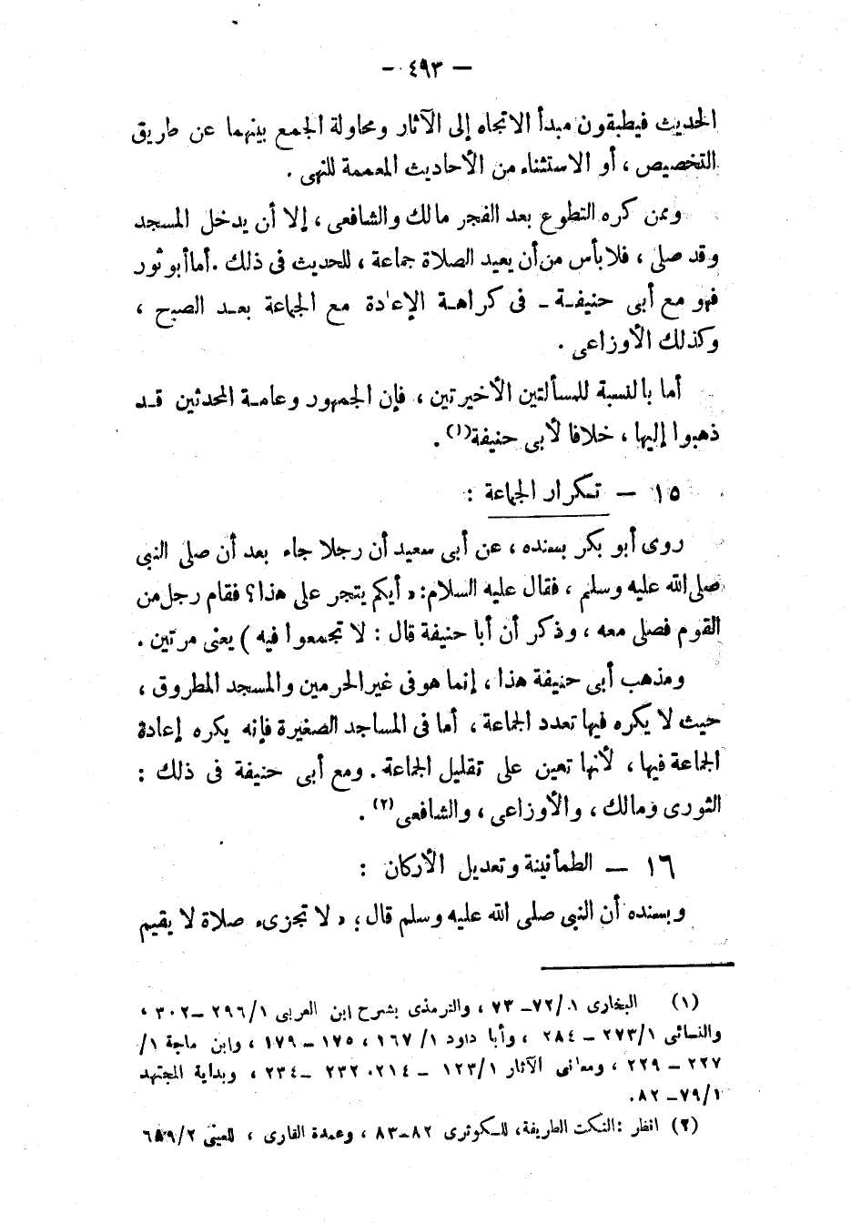 ومذهب أبي حنيفة هذا، إنما هو في غير الحرمين والمسجد المطروق، حيث لا يكره فيها تعدد الجماعة، أما في المساجد الصغيرة فإنه يكره إعادة الجماعة فيها، لأنها تعين على تقليل الجماعة. ومع أبي حنيفة في ذلك: الثوري، ومالك، والأوزاعي، والشافعي (¬2).