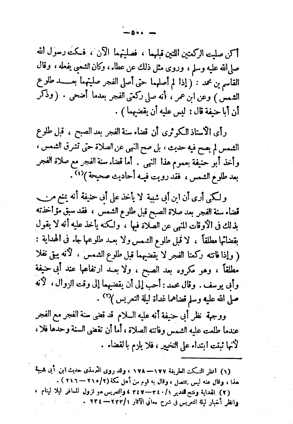 ولكني أرى أن ابن أبي شيبة لا يأخذ على أبي حنيفة أنه يمنع من قضاء سنة الفجر بعد صلاة الصبح قبل طلوع الشمس، فقد سبق مؤاخذته بذلك في الأوقات المنهي عن الصلاة فيها، ولكنه يأخذ عليه أنه لا يقول بقضائها مطلقًا، لا قبل طلوع الشمس ولا بعد طلوعها. جاء في " الهداية ": «(وَإِذَا فَاتَتْهُ رَكْعَتَا الفَجْرِ لَا يَقْضِيهِمَا قَبْلَ طُلُوعِ الشَّمْسِ) لأَنَّهُ يَبْقَى نَفْلاً مُطْلَقًا وَهُوَ مَكْرُوهٌ بَعْدَ الصُّبْحِ (وَلَا بَعْدَ ارْتِفَاعِهَا عِنْدَ أَبِي حَنِيفَةَ وَأَبِي يُوسُفَ. وَقَالَ مُحَمَّدٌ: " أَحَبُّ إلَيَّ أَنْ يَقْضِيَهُمَا إلَى وَقْتِ الزَّوَالِ ") لأَنَّهُ - عَلَيْهِ الصَّلاَةُ وَالسَّلاَمُ - قَضَاهُمَا بَعْدَ ارْتِفَاعِ الشَّمْسِ غَدَاةَ لَيْلَةِ التَّعْرِيسِ» (¬2).