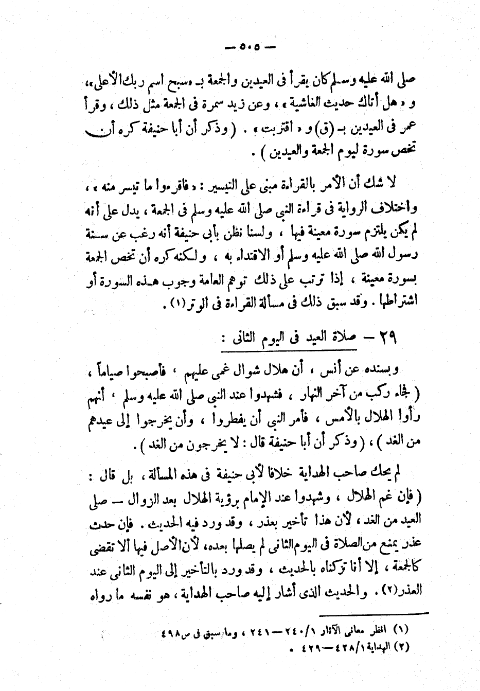 - «وَذُكِرَ أَنَّ أَبَا حَنِيفَةَ كَرِهَ أَنْ تُخَصَّ سُورَةٌ لِيَومِ الجُمُعَةِ وَالعِيدَيْنِ».