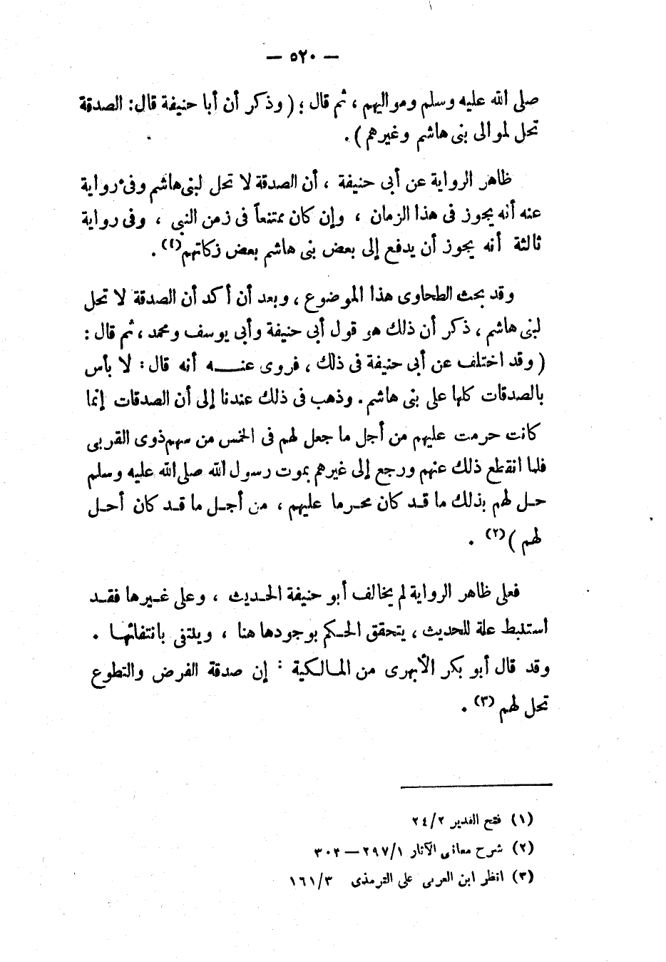وقد بحث الطحاوي هذا الموضوع، وبعد أن أكد أن الصدقة لا تحل لبني هاشم، ذكر أن ذلك هو قول أبي حنيفة وأبي يوسف ومحمد، ثم قال: «وَقَدِ اخْتُلِفَ عَنْ أَبِي حَنِيفَةَ - رَحِمَهُ اللهُ - فِي ذَلِكَ , فَرُوِيَ عَنْهُ أَنَّهُ قَالَ: " لَا بَأْسَ بِالصَّدَقَاتِ كُلِّهَا عَلَى بَنِي هَاشِمٍ. وَذَهَبَ فِي ذَلِكَ عِنْدَنَا إِلَى أَنَّ الصَّدَقَاتِ إِنَّمَا كَانَتْ حَرُمَتْ عَلَيْهِمْ مِنْ أَجْلِ مَا جُعِلَ لَهُمْ فِي الْخُمُسِ مِنْ سَهْمِ ذَوِي القُرْبَى. فَلَمَّا انْقَطَعَ ذَلِكَ عَنْهُمْ وَرَجَعَ إِلَى غَيْرِهِمْ , بِمَوْتِ رَسُولِ اللهِ - صَلَّى اللَّهُ عَلَيْهِ وَسَلَّمَ -، حَلَّ لَهُمْ بِذَلِكَ مَا قَدْ كَانَ مُحَرَّمًا عَلَيْهِمْ مِنْ أَجْلِ مَا قَدْ كَانَ أُحِلَّ لَهُمْ "» (¬2).