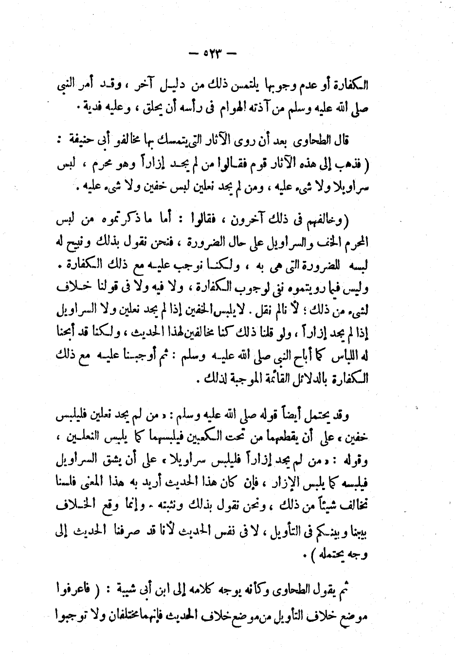 وَخَالَفَهُمْ فِي ذَلِكَ آخَرُونَ فَقَالُوا: أَمَّا مَا ذَكَرْتُمُوهُ مِنْ لُبْسِ المُحْرِمِ الخُفَّ وَالسَّرَاوِيلَ [عَلَى الضَّرُورَةِ] فَنَحْنُ نَقُولُ بِذَلِكَ وَنُبِيحُ لَهُ لُبْسَهُ لِلضَّرُورَةِ التِي هِيَ بِهِ. وَلَكِنَّا نُوجِبُ عَلَيْهِ مَعَ ذَلِكَ الكَفَّارَةَ وَلَيْسَ فِيمَا رَوَيْتُمُوهُ نَفْيٌ لِوُجُوبِ الكَفَّارَةِ، وَلَا فِيهِ وَلَا فِي قَوْلِنَا خِلاَفٌ لِشَيْءٍ مِنْ ذَلِكَ. لِأَنَّا لَمْ نَقُلْ: لَا يَلْبَسُ الخُفَّيْنِ إِذَا لَمْ يَجِدْ نَعْلَيْنِ وَلَا السَّرَاوِيلَ إِذَا لَمْ يَجِدْ إِزَارًا. وَلَوْ قُلْنَا ذَلِكَ كُنَّا مُخَالِفِينَ لِهَذَا الحَدِيثِ وَلَكِنَّا قَدْ أَبَحْنَا لَهُ اللِّبَاسَ كَمَا أَبَاحَ لَهُ النَّبِيُّ - صَلَّى اللَّهُ عَلَيْهِ وَسَلَّمَ - ثُمَّ أَوْجَبْنَا عَلَيْهِ مَعَ ذَلِكَ الكَفَّارَةَ بِالدَّلاَئِلِ القَائِمَةِ المُوجِبَةِ لِذَلِكَ.